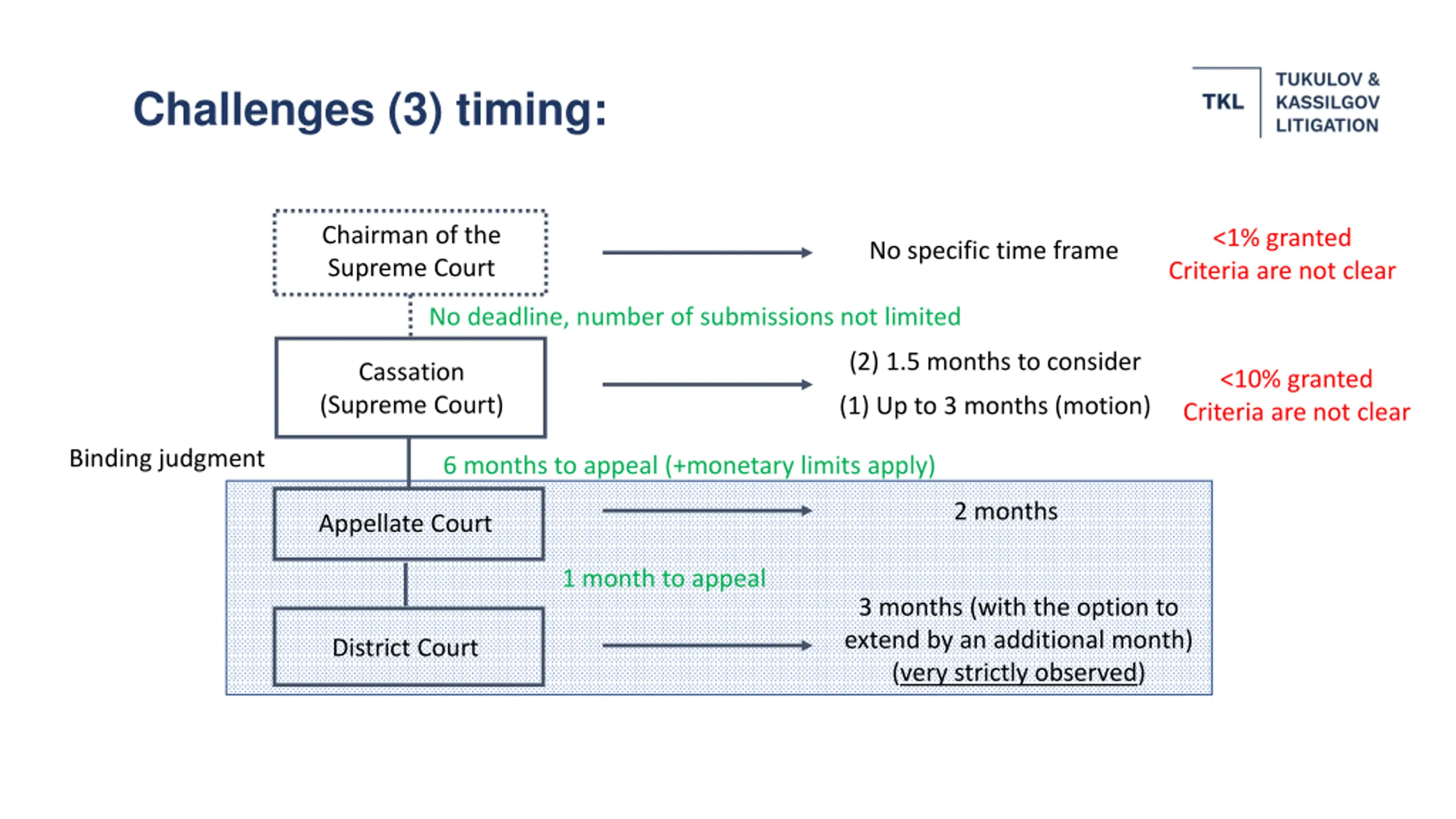 Challenges (3) timing: Chairman of the Supreme Court <1% granted Criteria are not clear No specific time frame No deadline, number of submissions not limited (2) 1.5 months to consider Cassation (Supreme Court) <10% granted Criteria are not clear (1) Up to 3 months (motion) Binding judgment 6 months to appeal (+monetary limits apply) 2 months Appellate Court 1 month to appeal 3 months (with the option to extend by an additional month) (very strictly observed) District Court