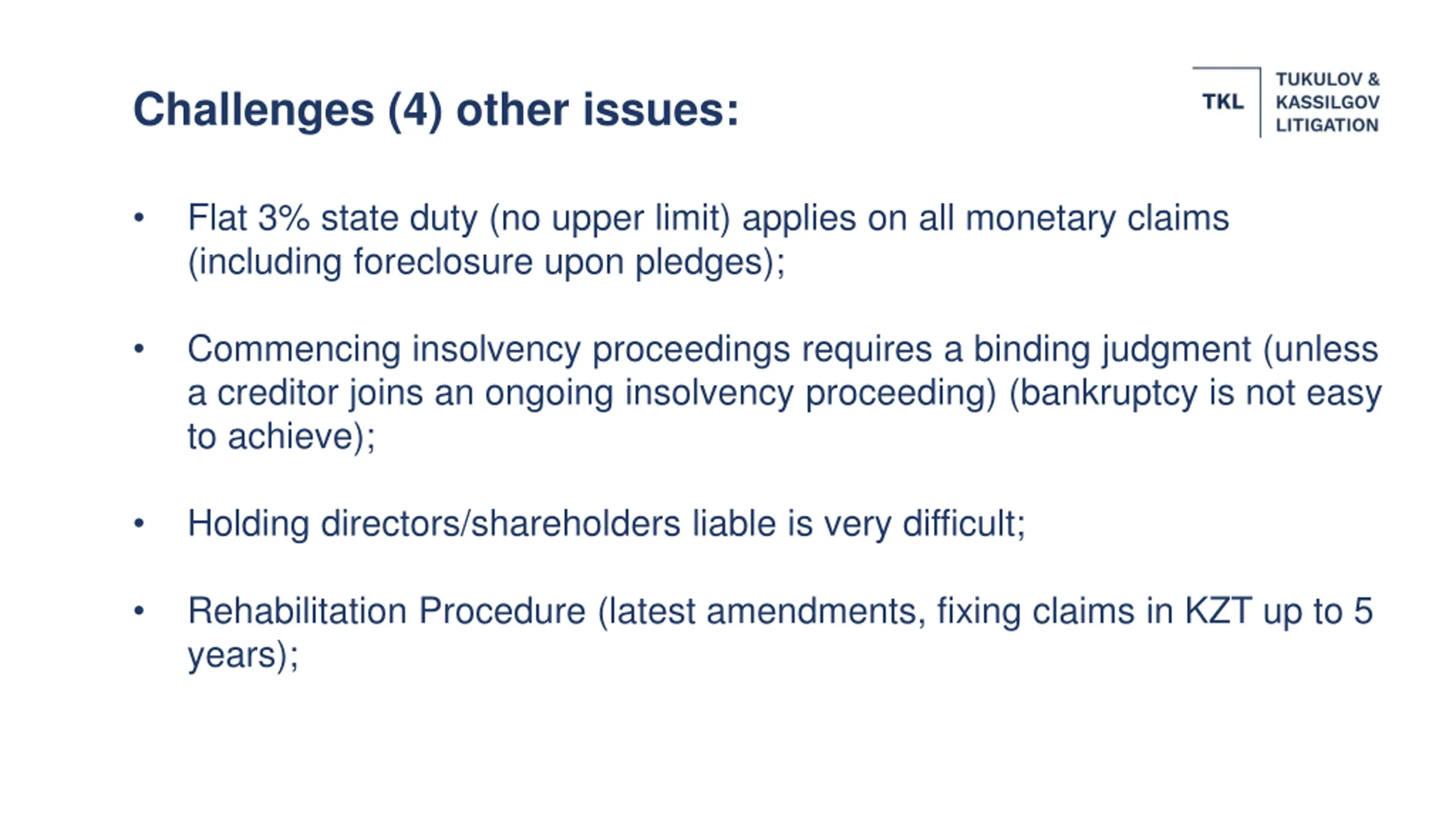 Challenges (4) other issues: Flat 3% state duty (no upper limit) applies on all monetary claims (including foreclosure upon pledges); Commencing insolvency proceedings requires a binding judgment (unless a creditor joins an ongoing insolvency proceeding) (bankruptcy is not easy to achieve); Holding directors/shareholders liable is very difficult; Rehabilitation Procedure (latest amendments, fixing claims in KZT up to 5 years);
