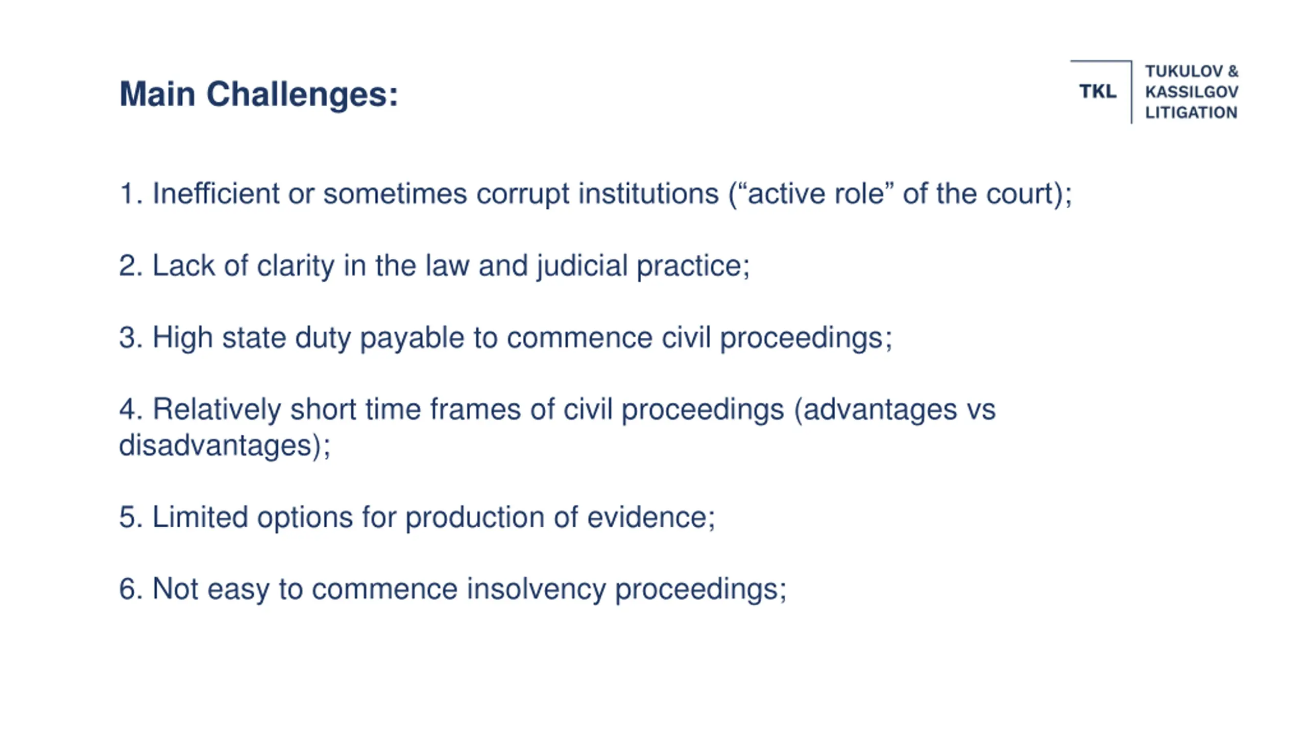 Main Challenges: 1. Inefficient or sometimes corrupt institutions ( active role of the court); 2. Lack of clarity in the law and judicial practice; 3. High state duty payable to commence civil proceedings; 4. Relatively short time frames of civil proceedings (advantages vs disadvantages); 5. Limited options for production of evidence; 6. Not easy to commence insolvency proceedings;