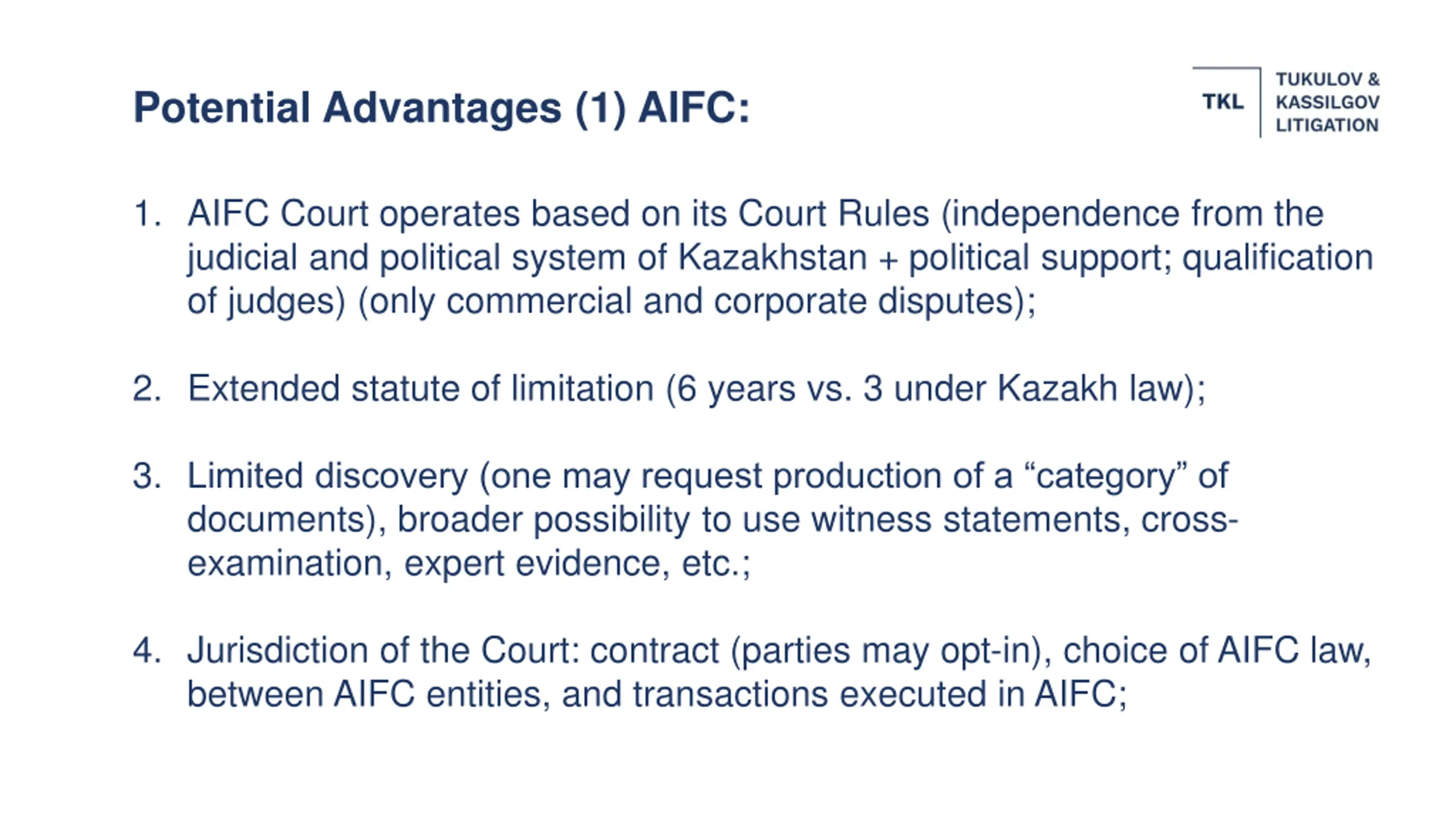 Potential Advantages (1) AIFC: 1. AIFC Court operates based on its Court Rules (independence from the judicial and political system of Kazakhstan + political support; qualification of judges) (only commercial and corporate disputes); 2. Extended statute of limitation (6 years vs. 3 under Kazakh law); 3. Limited discovery (one may request production of a category of documents), broader possibility to use witness statements, cross- examination, expert evidence, etc.; 4. Jurisdiction of the Court: contract (parties may opt-in), choice of AIFC law, between AIFC entities, and transactions executed in AIFC;