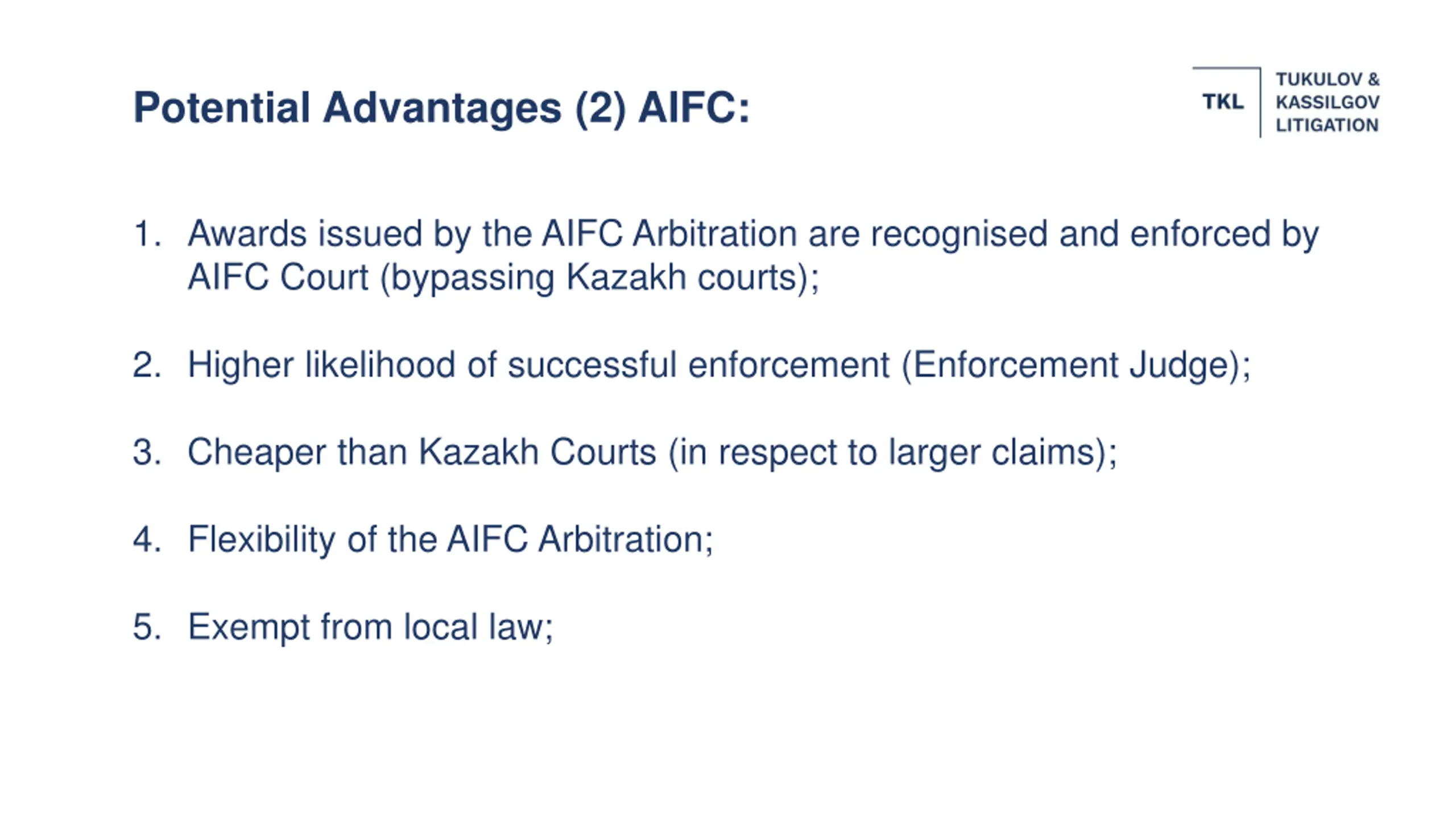 Potential Advantages (2) AIFC: 1. Awards issued by the AIFC Arbitration are recognised and enforced by AIFC Court (bypassing Kazakh courts); 2. Higher likelihood of successful enforcement (Enforcement Judge); 3. Cheaper than Kazakh Courts (in respect to larger claims); 4. Flexibility of the AIFC Arbitration; 5. Exempt from local law;