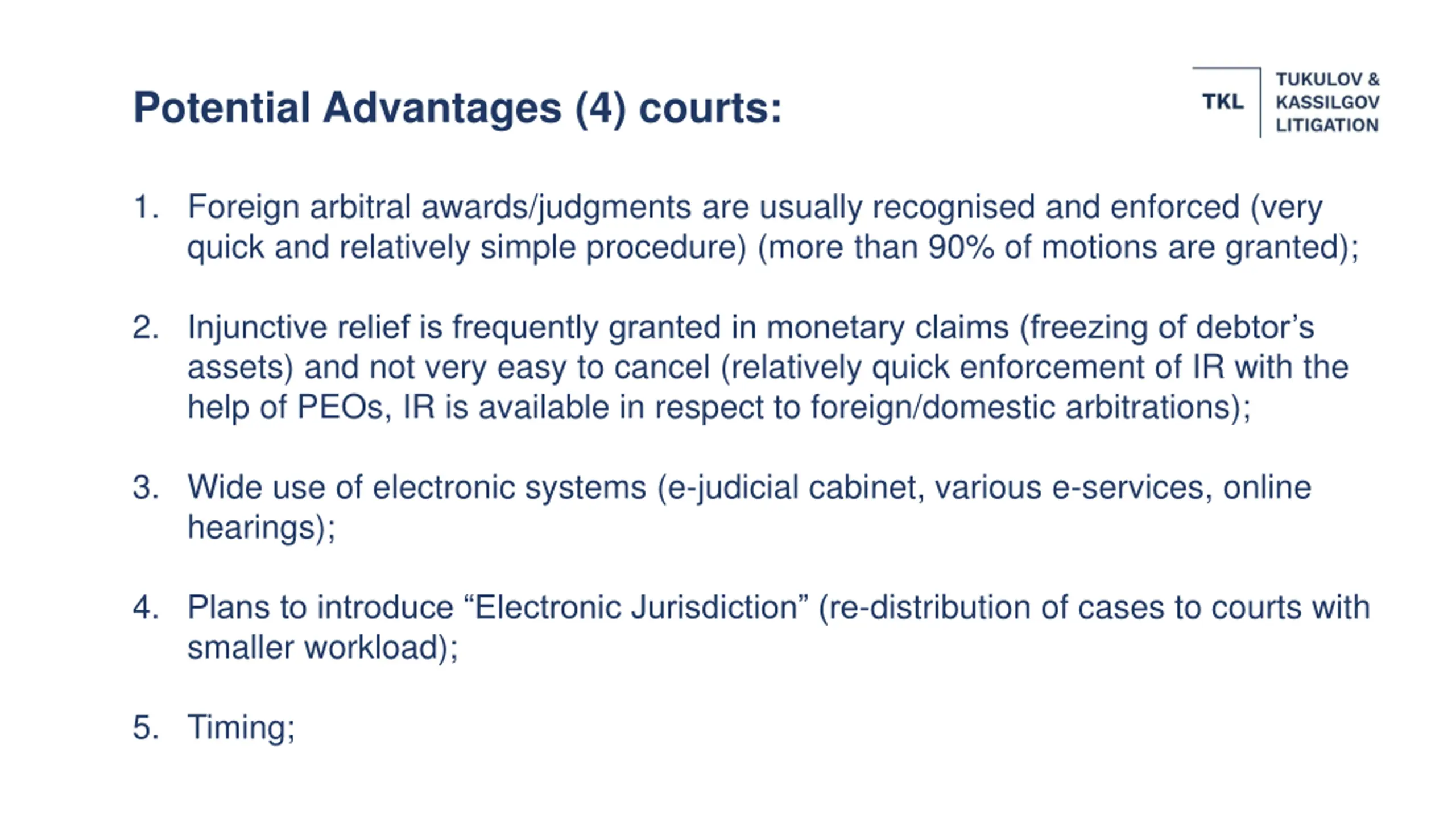 Potential Advantages (4) courts: 1. Foreign arbitral awards/judgments are usually recognised and enforced (very quick and relatively simple procedure) (more than 90% of motions are granted); 2. Injunctive relief is frequently granted in monetary claims (freezing of debtor s assets) and not very easy to cancel (relatively quick enforcement of IR with the help of PEOs, IR is available in respect to foreign/domestic arbitrations); 3. Wide use of electronic systems (e-judicial cabinet, various e-services, online hearings); 4. Plans to introduce Electronic Jurisdiction (re-distribution of cases to courts with smaller workload); 5. Timing;