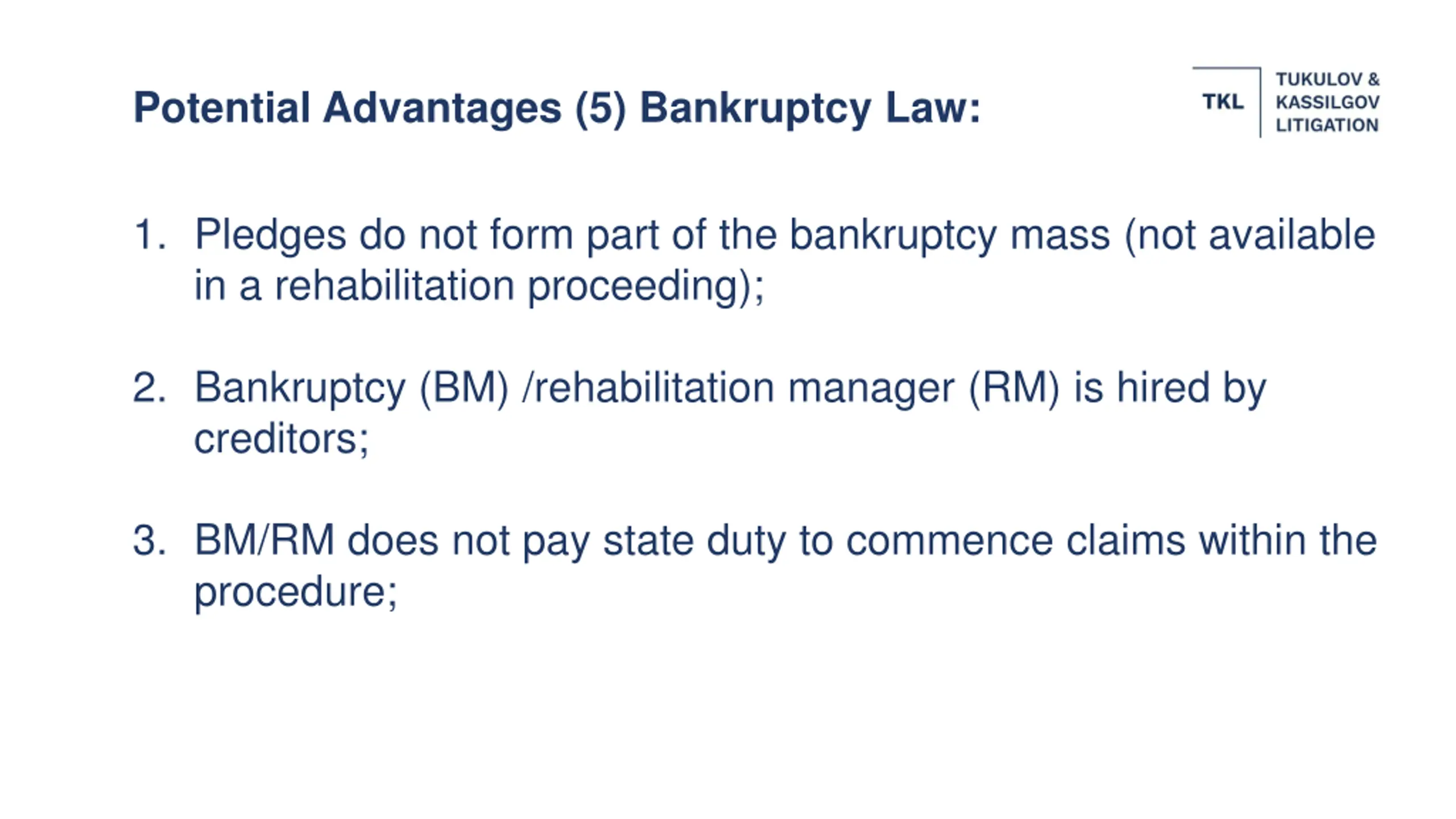Potential Advantages (5) Bankruptcy Law: 1. Pledges do not form part of the bankruptcy mass (not available in a rehabilitation proceeding); 2. Bankruptcy (BM) /rehabilitation manager (RM) is hired by creditors; 3. BM/RM does not pay state duty to commence claims within the procedure;