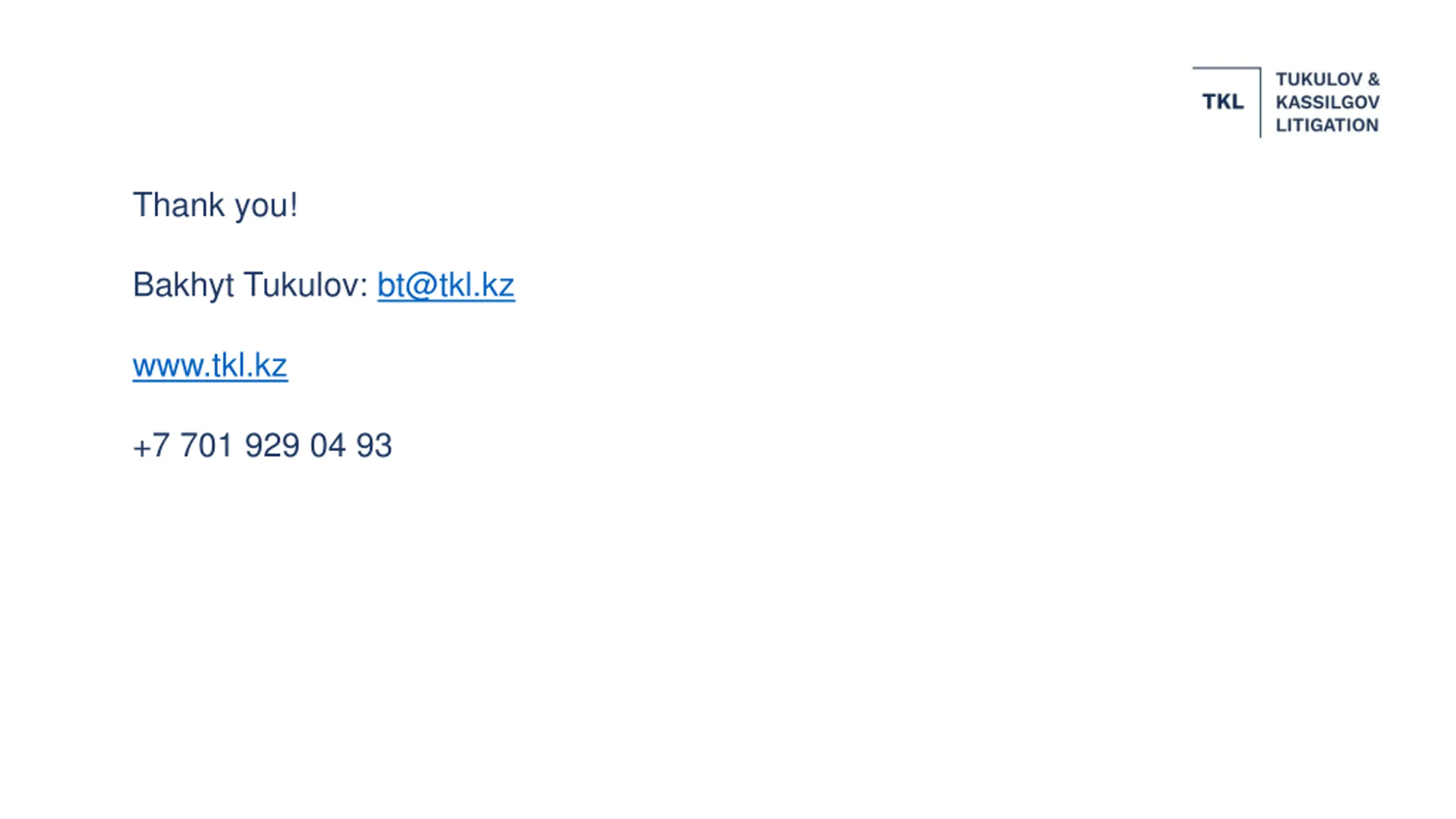 Thank you! Bakhyt Tukulov: bt@tkl.kz www.tkl.kz +7 701 929 04 93