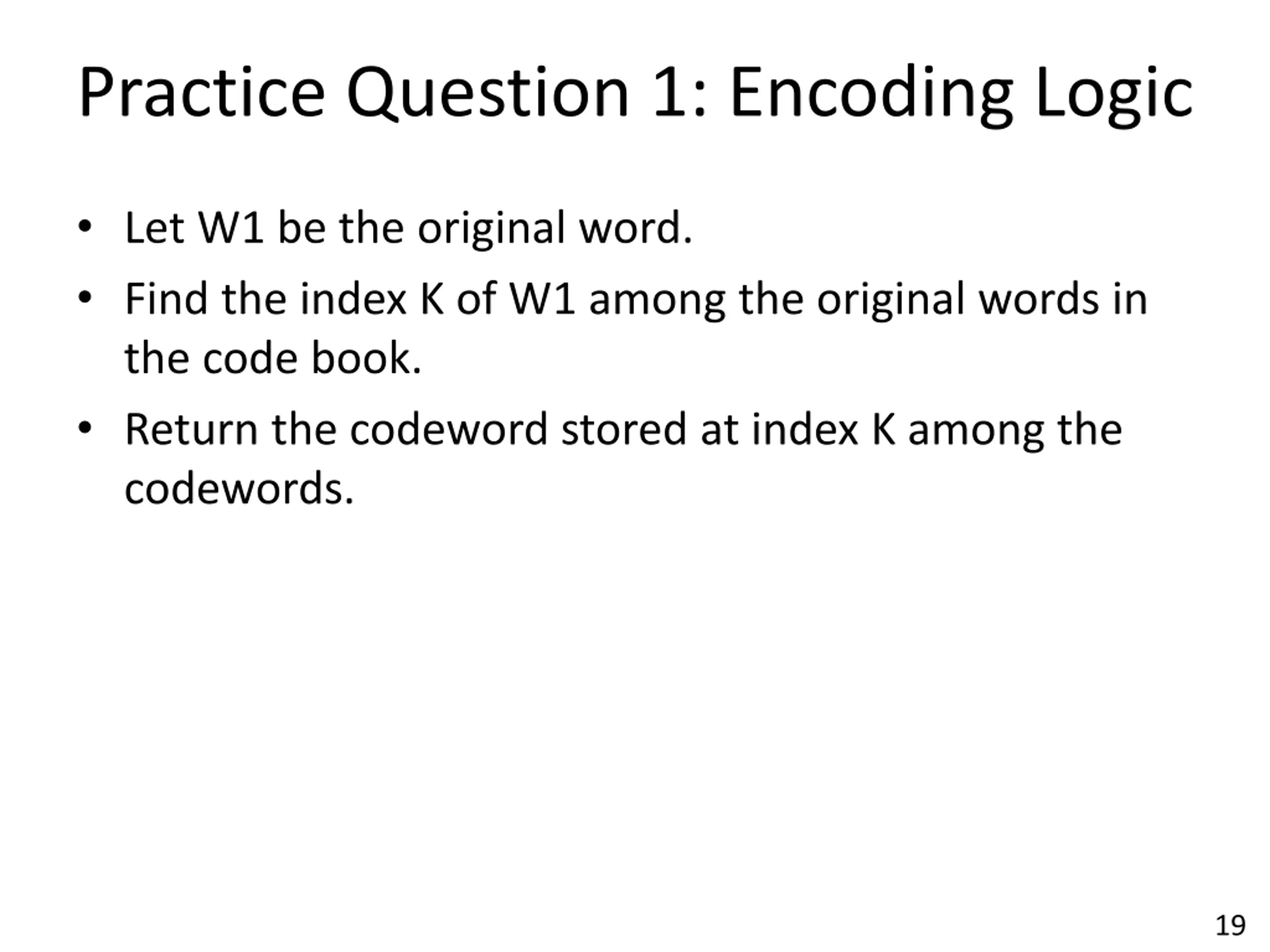 Practice Question 1: Encoding Logic Let W1 be the original word. Find the index K of W1 among the original words in the code book. Return the codeword stored at index K among the codewords. 19