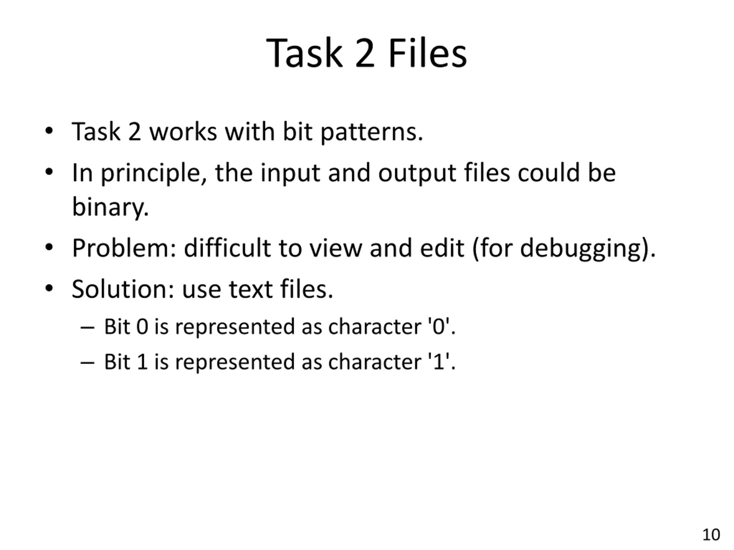 Task 2 Files Task 2 works with bit patterns. In principle, the input and output files could be binary. Problem: difficult to view and edit (for debugging). Solution: use text files. Bit 0 is represented as character '0'. Bit 1 is represented as character '1'. 10