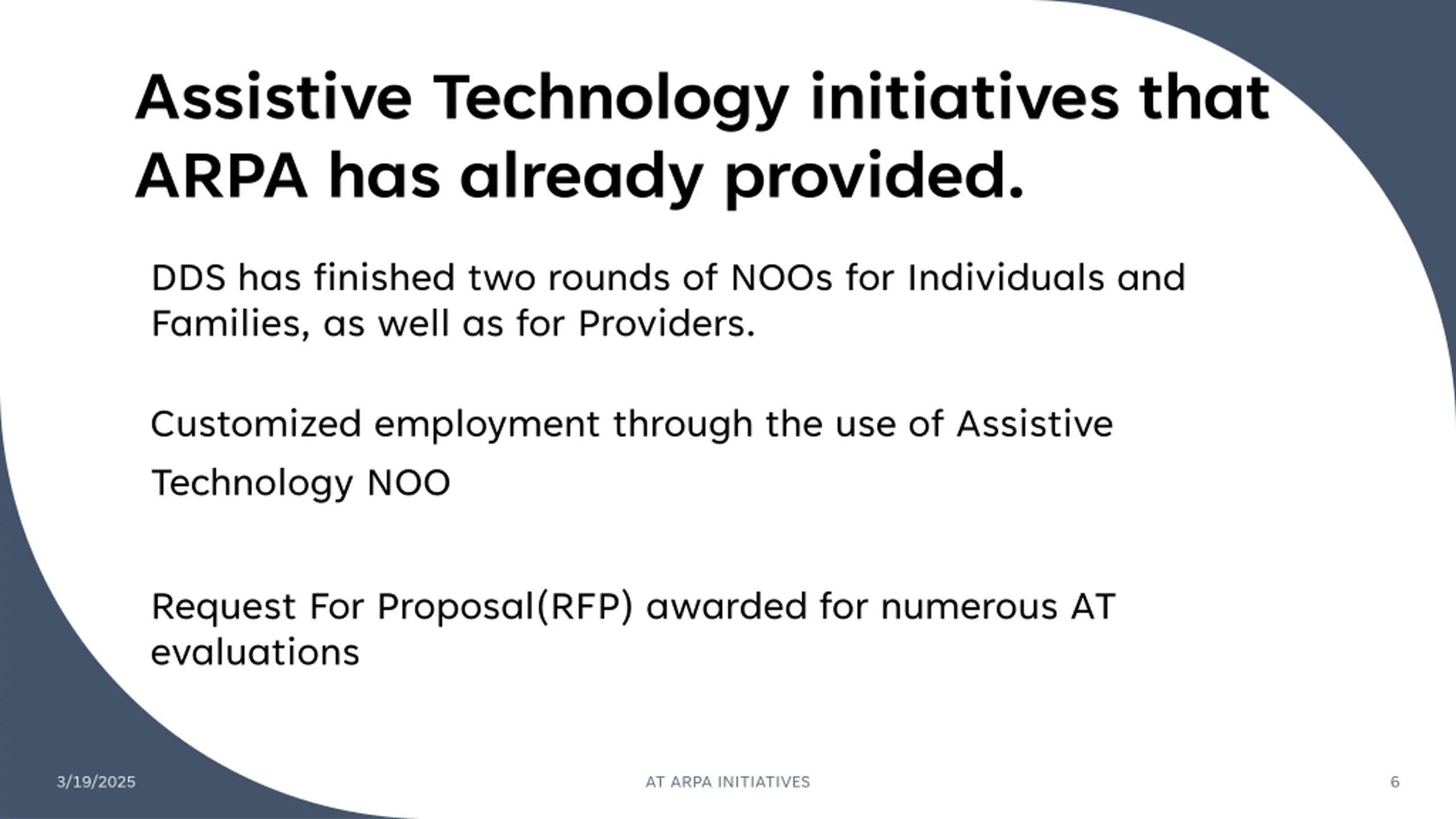 Assistive Technology initiatives that ARPA has already provided. DDS has finished two rounds of NOOs for Individuals and Families, as well as for Providers. Customized employment through the use of Assistive Technology NOO Request For Proposal(RFP) awarded for numerous AT evaluations 3/19/2025 AT ARPA INITIATIVES 6
