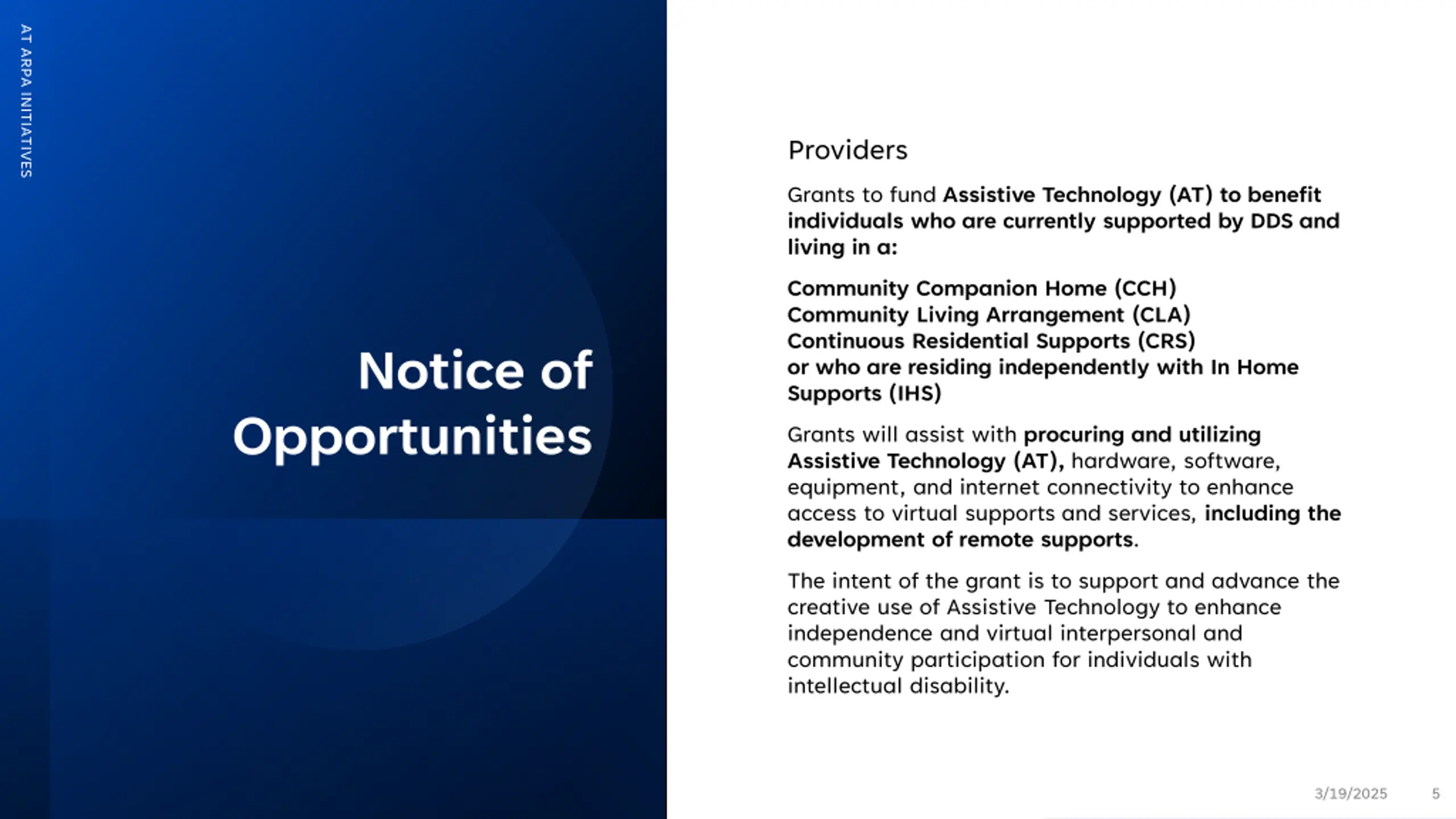 Notice of Opportunities Individuals and Families DDS Case Managers will submit applications on behalf of individuals and families interested in receiving grants to fund Assistive Technology (AT). These grants are intended to benefit individuals who are currently supported by DDS and are living in a family home or residing independently with or without In Home Supports (IHS). Grants will assist with procuring and utilizing Assistive Technology (AT), hardware, software, equipment, and internet connectivity to enhance access to virtual supports and services, including the development of remote supports. The intent of the grant is to support and advance the creative use of Assistive Technology to enhance independence and virtual interpersonal and community participation for individuals with intellectual disabilities. 3/19/2025 AT ARPA INITIATIVES 4