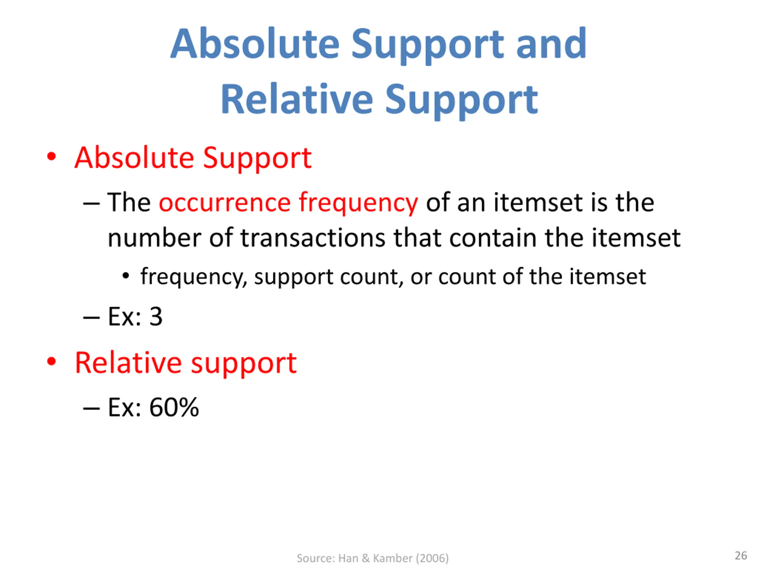 Absolute Support and Relative Support Absolute Support The occurrence frequency of an itemset is the number of transactions that contain the itemset frequency, support count, or count of the itemset Ex: 3 Relative support Ex: 60% 26 Source: Han & Kamber (2006)