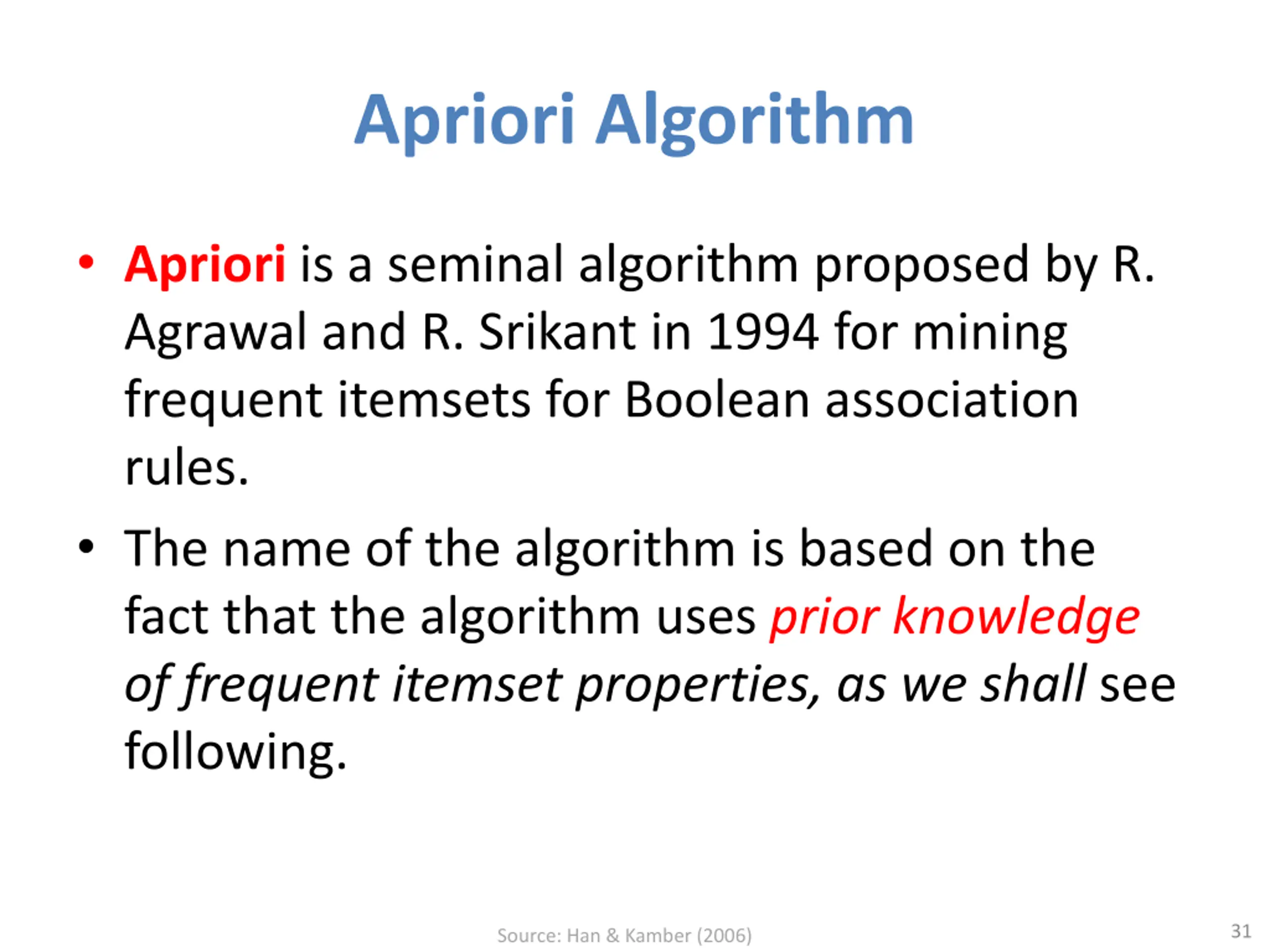 Apriori Algorithm Apriori is a seminal algorithm proposed by R. Agrawal and R. Srikant in 1994 for mining frequent itemsets for Boolean association rules. The name of the algorithm is based on the fact that the algorithm uses prior knowledge of frequent itemset properties, as we shall see following. 31 Source: Han & Kamber (2006)