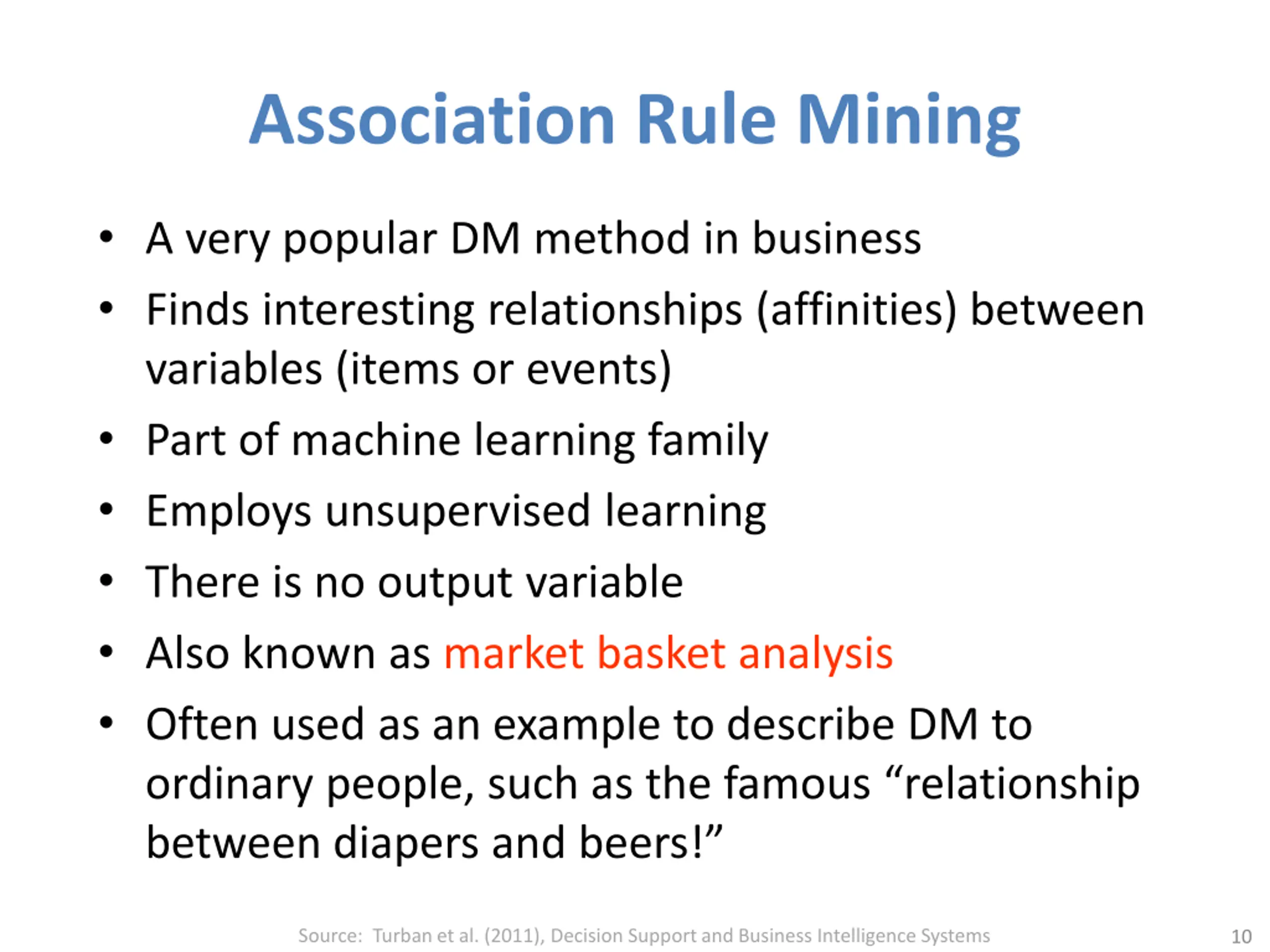 Association Rule Mining A very popular DM method in business Finds interesting relationships (affinities) between variables (items or events) Part of machine learning family Employs unsupervised learning There is no output variable Also known as market basket analysis Often used as an example to describe DM to ordinary people, such as the famous relationship between diapers and beers! Source: Turban et al. (2011), Decision Support and Business Intelligence Systems 10
