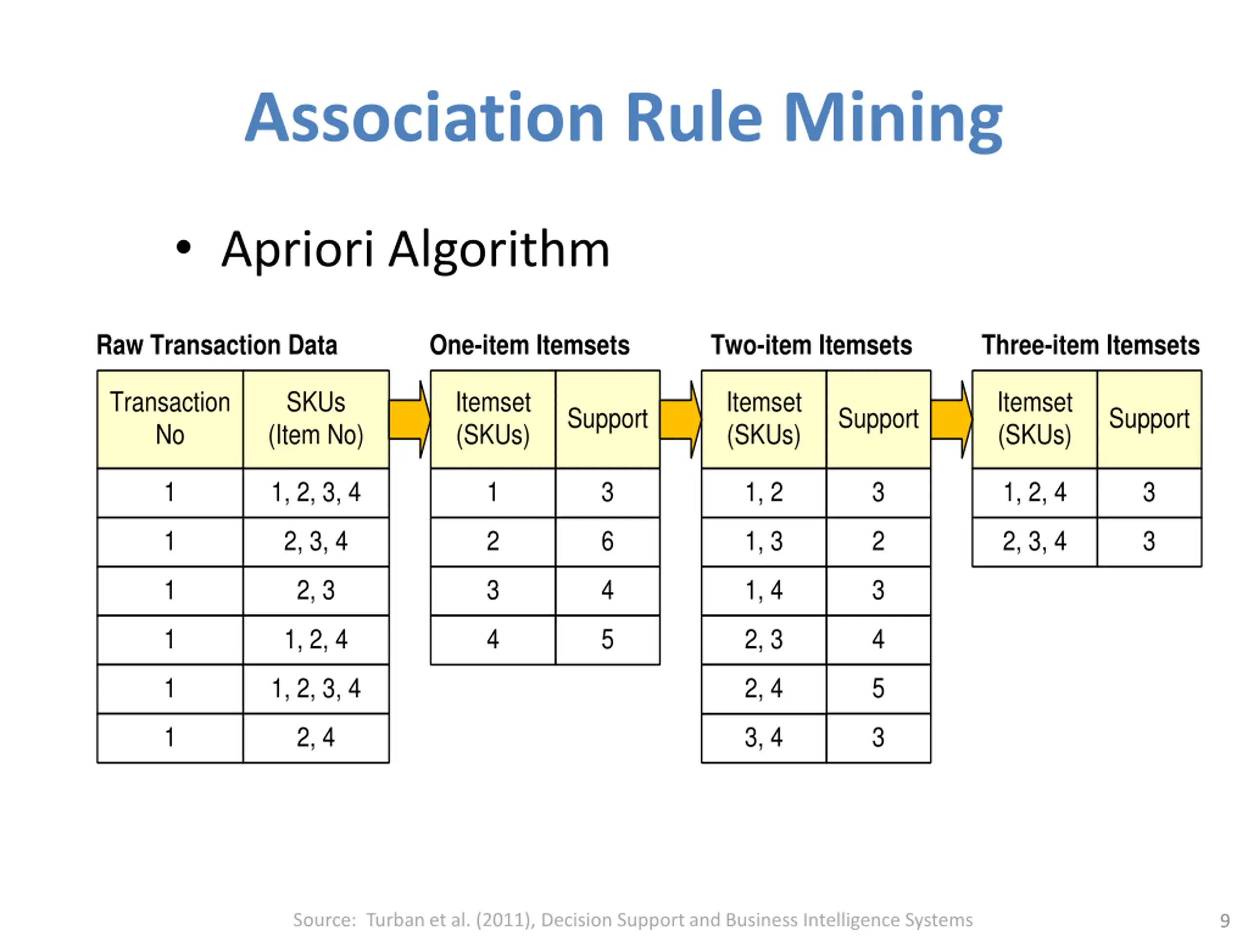 Association Rule Mining Apriori Algorithm Finds subsets that are common to at least a minimum number of the itemsets uses a bottom-up approach frequent subsets are extended one item at a time (the size of frequent subsets increases from one-item subsets to two-item subsets, then three-item subsets, and so on), and groups of candidates at each level are tested against the data for minimum Source: Turban et al. (2011), Decision Support and Business Intelligence Systems 15