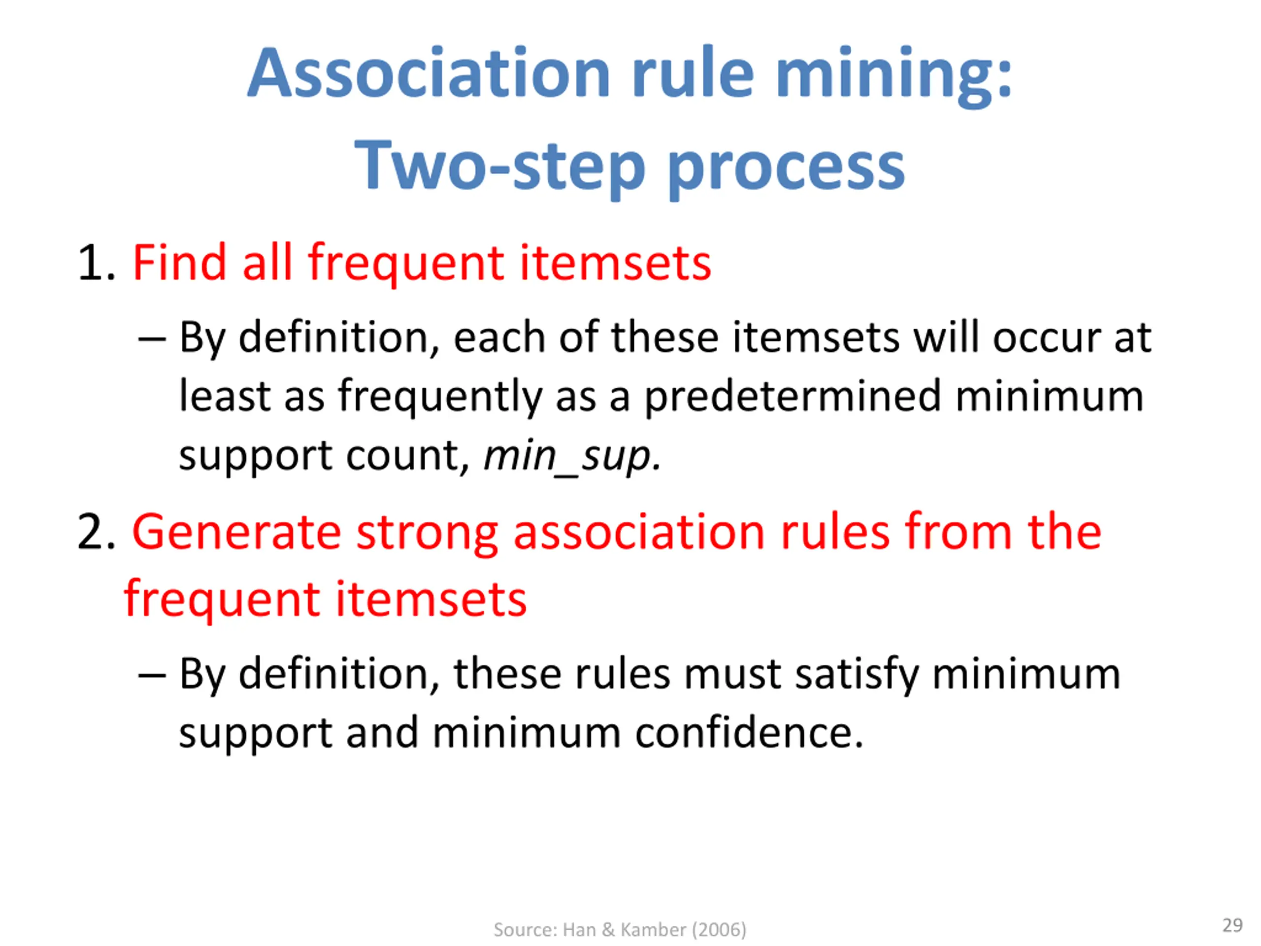 Association rule mining: Two-step process 1. Find all frequent itemsets By definition, each of these itemsets will occur at least as frequently as a predetermined minimum support count, min_sup. 2. Generate strong association rules from the frequent itemsets By definition, these rules must satisfy minimum support and minimum confidence. 29 Source: Han & Kamber (2006)