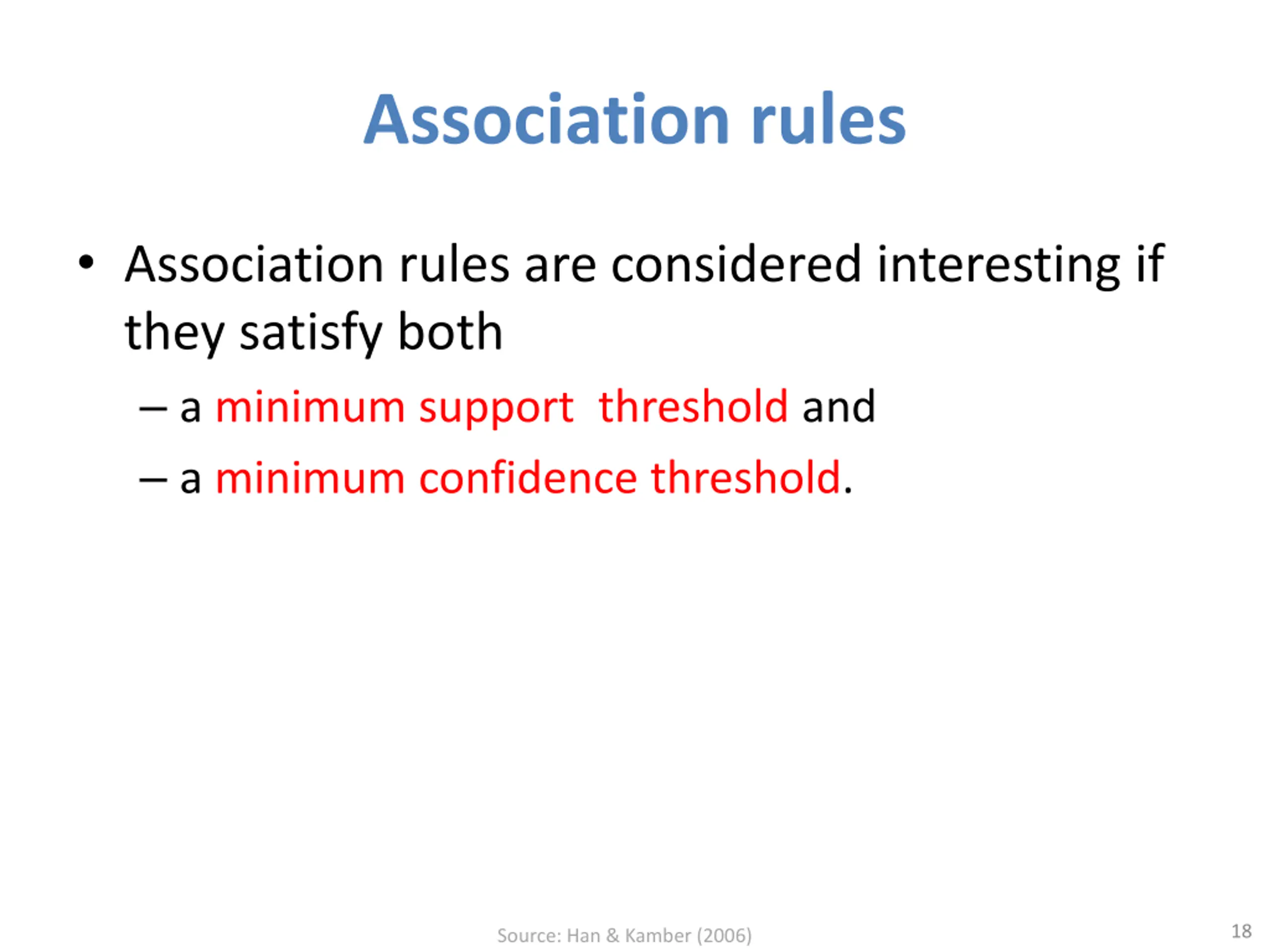 Association rules Association rules are considered interesting if they satisfy both a minimum support threshold and a minimum confidence threshold. 18 Source: Han & Kamber (2006)