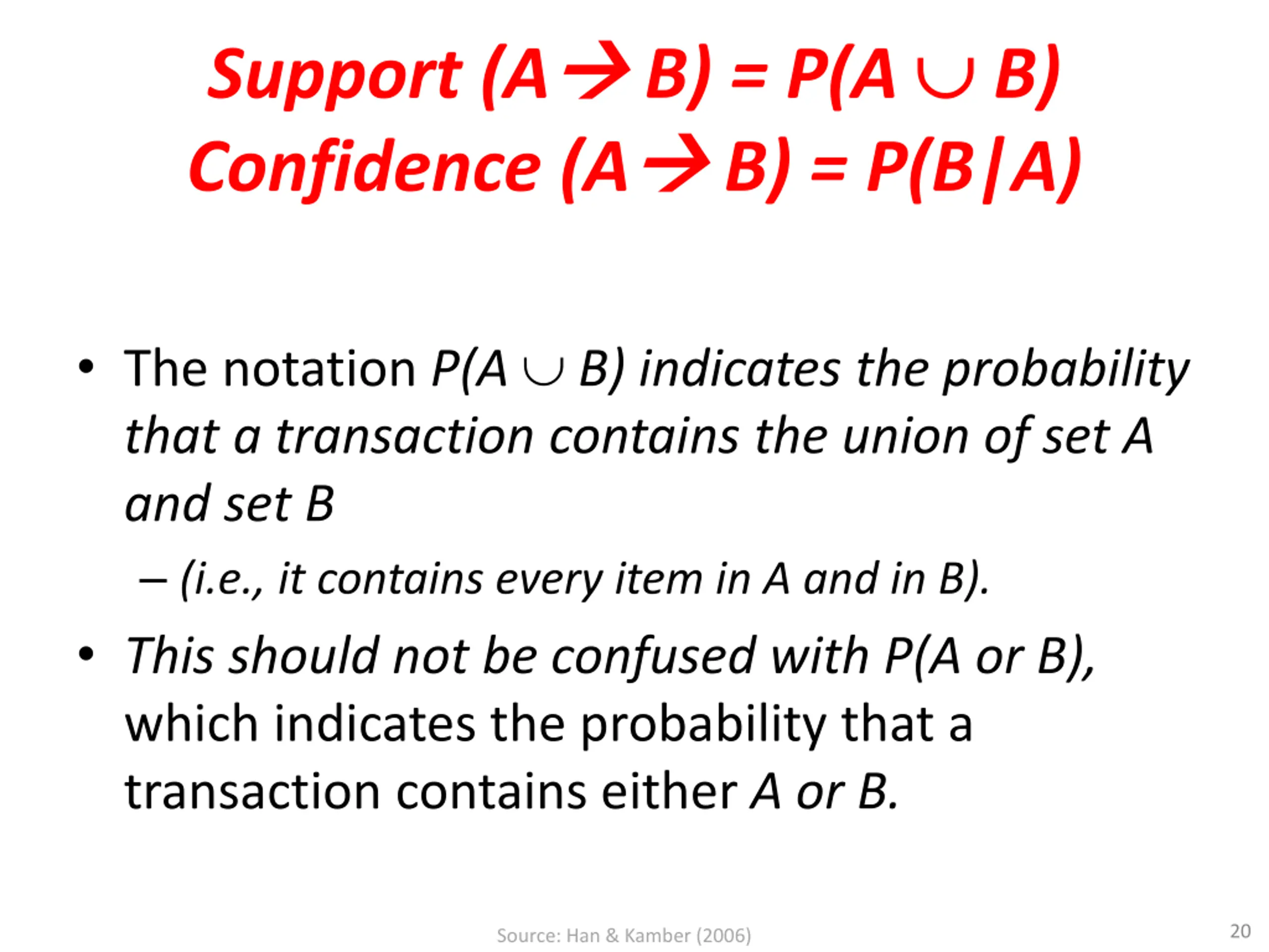 B) = P(A B) B) = P(B|A) Support (A Confidence (A The notation P(A B) indicates the probability that a transaction contains the union of set A and set B (i.e., it contains every item in A and in B). This should not be confused with P(A or B), which indicates the probability that a transaction contains either A or B. 20 Source: Han & Kamber (2006)