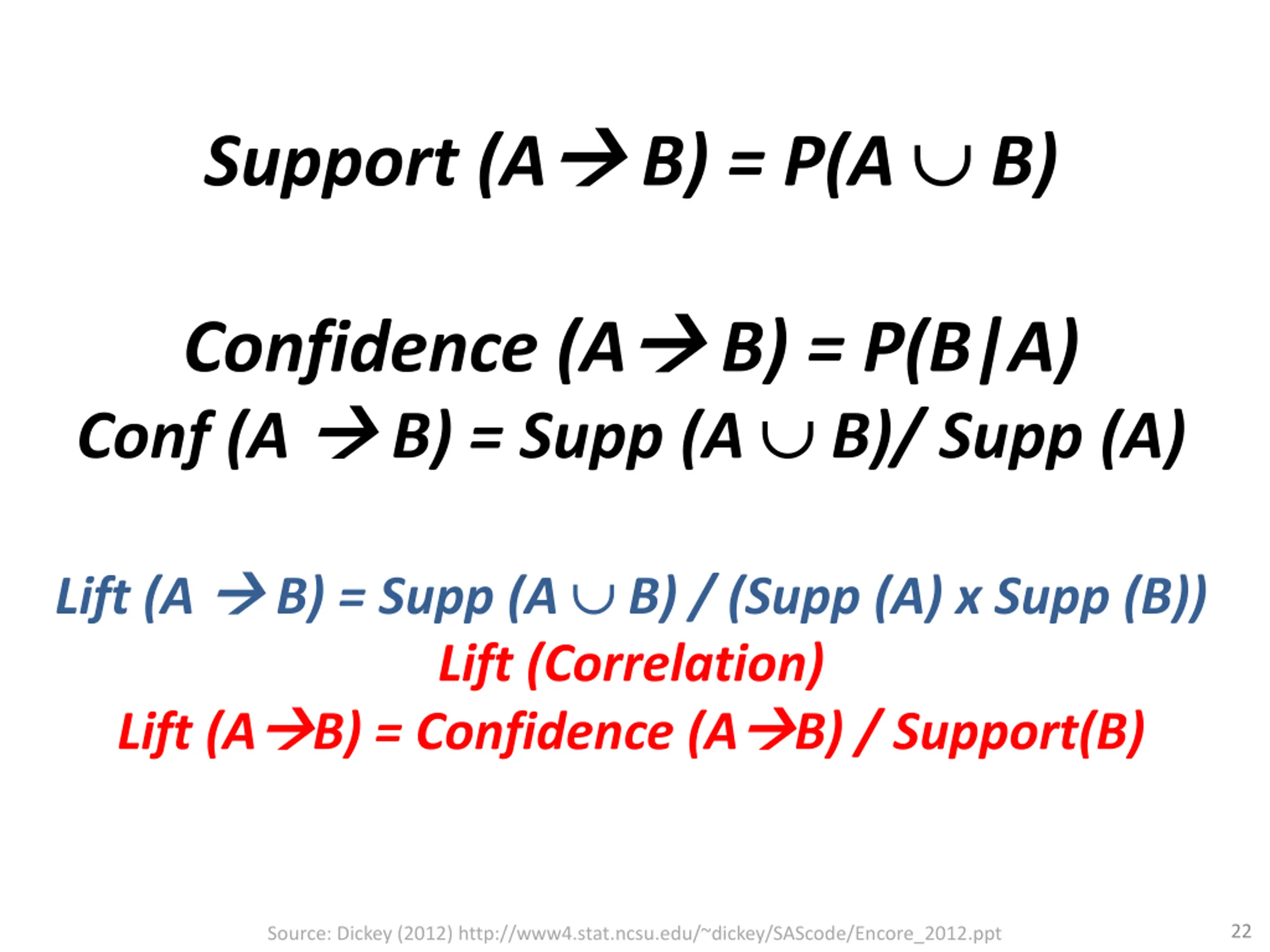 B) = P(A B) Support (A Confidence (A Conf (A B) = Supp (A B)/ Supp (A) B) = P(B|A) B) = Supp (A B) / (Supp (A) x Supp (B)) Lift (Correlation) Lift (A B) = Confidence (A Lift (A B) / Support(B) 22 Source: Dickey (2012) http://www4.stat.ncsu.edu/~dickey/SAScode/Encore_2012.ppt