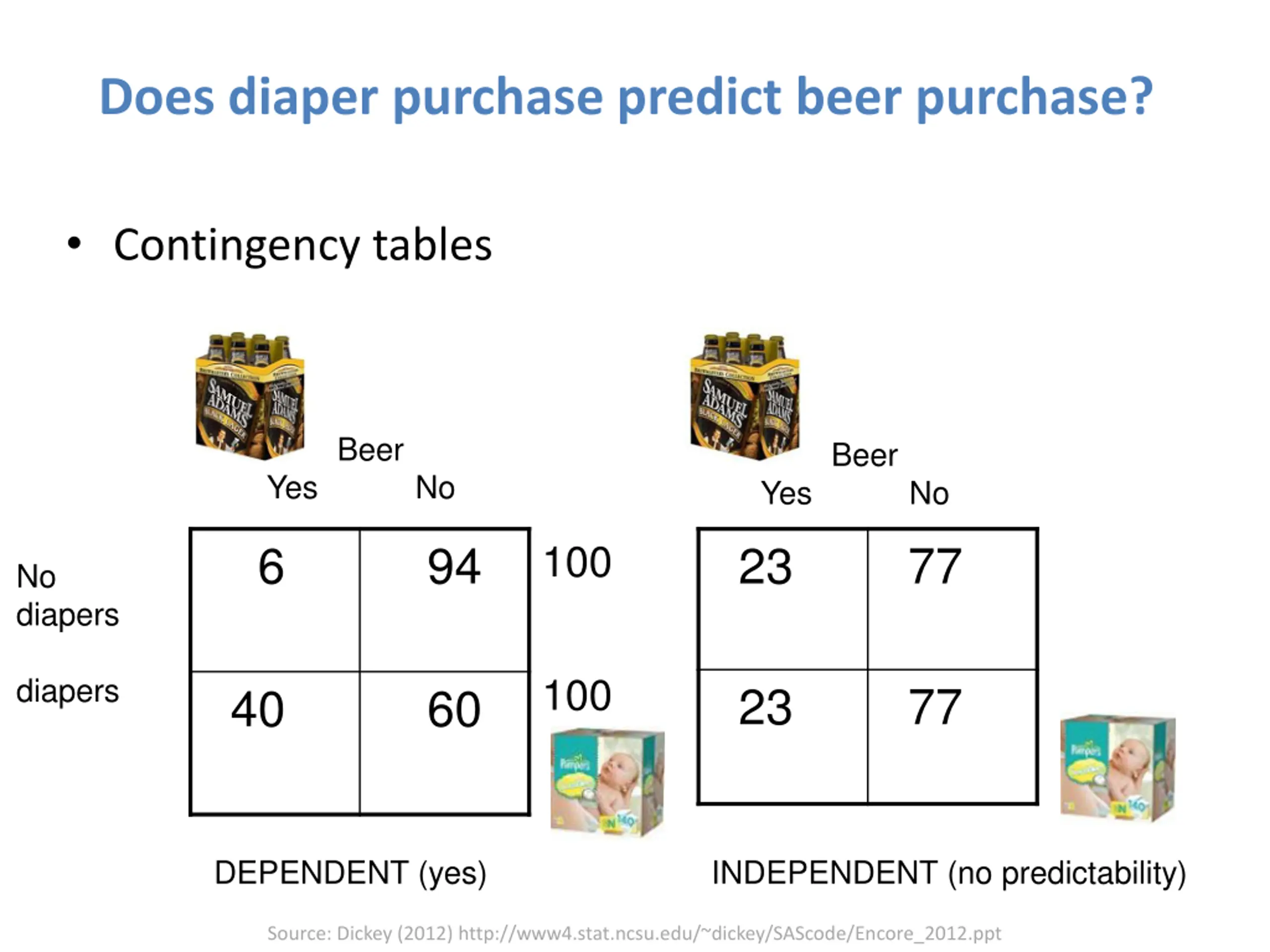 Does diaper purchase predict beer purchase? Contingency tables Beer Beer Yes No Yes No 100 6 94 23 77 No diapers 100 diapers 23 77 40 60 DEPENDENT (yes) INDEPENDENT (no predictability) Source: Dickey (2012) http://www4.stat.ncsu.edu/~dickey/SAScode/Encore_2012.ppt