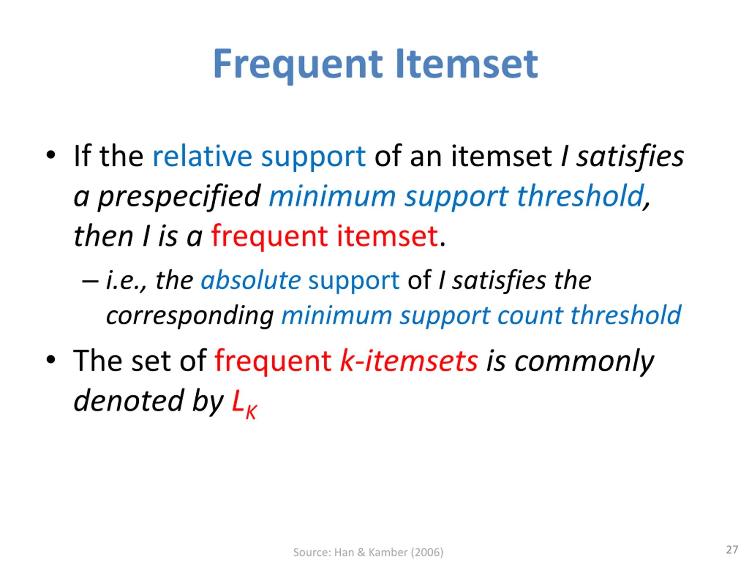 Frequent Itemset If the relative support of an itemset I satisfies a prespecified minimum support threshold, then I is a frequent itemset. i.e., the absolute support of I satisfies the corresponding minimum support count threshold The set of frequent k-itemsets is commonly denoted by LK 27 Source: Han & Kamber (2006)