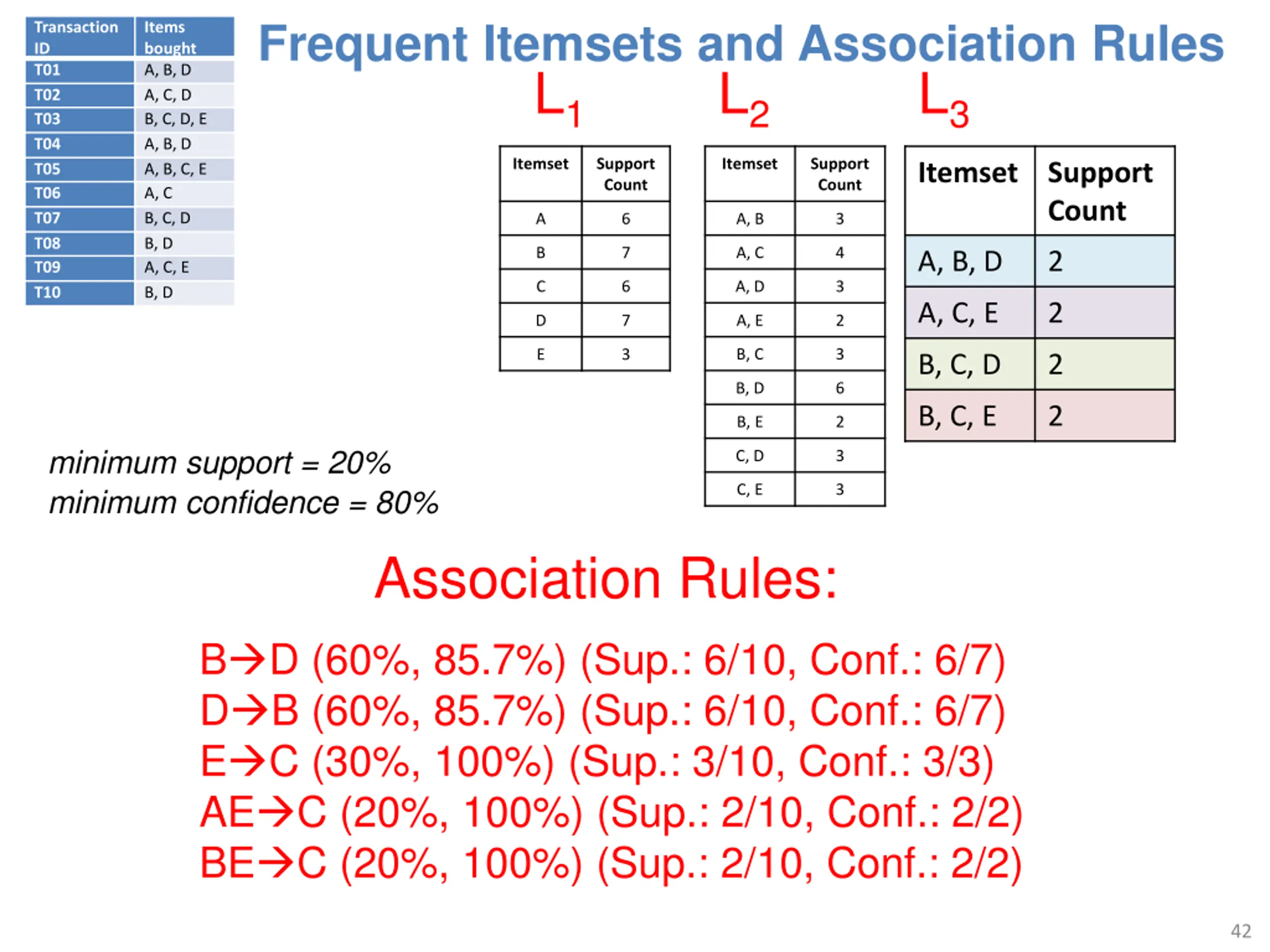 Step 2-2 Generating Association Rules Transaction ID T01 T02 T03 T04 T05 T06 T07 T08 T09 T10 Items bought A, B, D A, C, D B, C, D, E A, B, D A, B, C, E A, C B, C, D B, D A, C, E B, D minimum confidence = 80% Association Rules Generated from L3 A BD: 2/6 B AD: 2/7 D AB: 2/7 AB D: 2/3 AD B: 2/3 BD A: 2/6 A CE: 2/6 C AE: 2/6 E AC: 2/3 AC E: 2/4 AE C: 2/2=100%* CE A: 2/3 B CD: 2/7 C BD: 2/6 D BC: 2/7 BC D: 2/3 BD C: 2/6 CD B: 2/3 B CE: 2/7 C BE: 2/6 E BC: 2/3 BC E: 2/3 BE C: 2/2=100%* CE B: 2/3 L1 L2 Itemset L3 Itemset Itemset Support Count Support Count Support Count A, B 3 A 6 A, B, D 2 A, C 4 B 7 C 6 A, D 3 A, C, E 2 D 7 A, E 2 B, C, D 2 E 3 B, C 3 B, C, E 2 B, D 6 B, E 2 C, D 3 C, E 3 41
