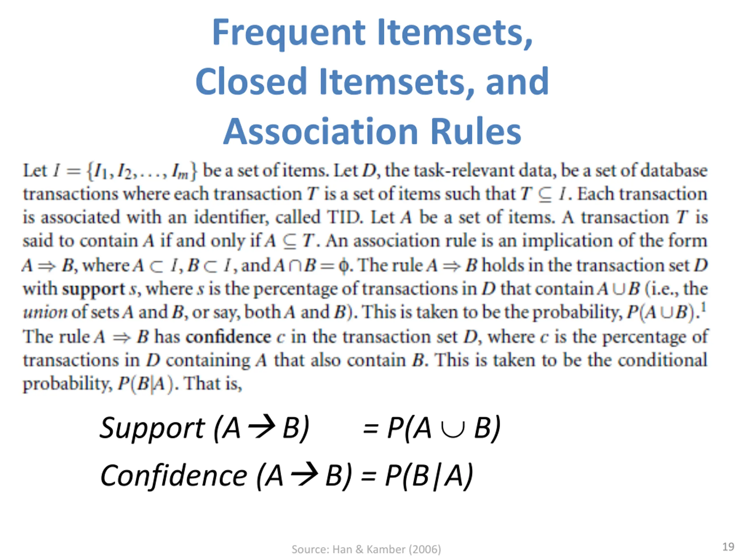 Frequent Itemsets, Closed Itemsets, and Association Rules Support (A B) = P(A B) Confidence (A B) = P(B|A) 19 Source: Han & Kamber (2006)