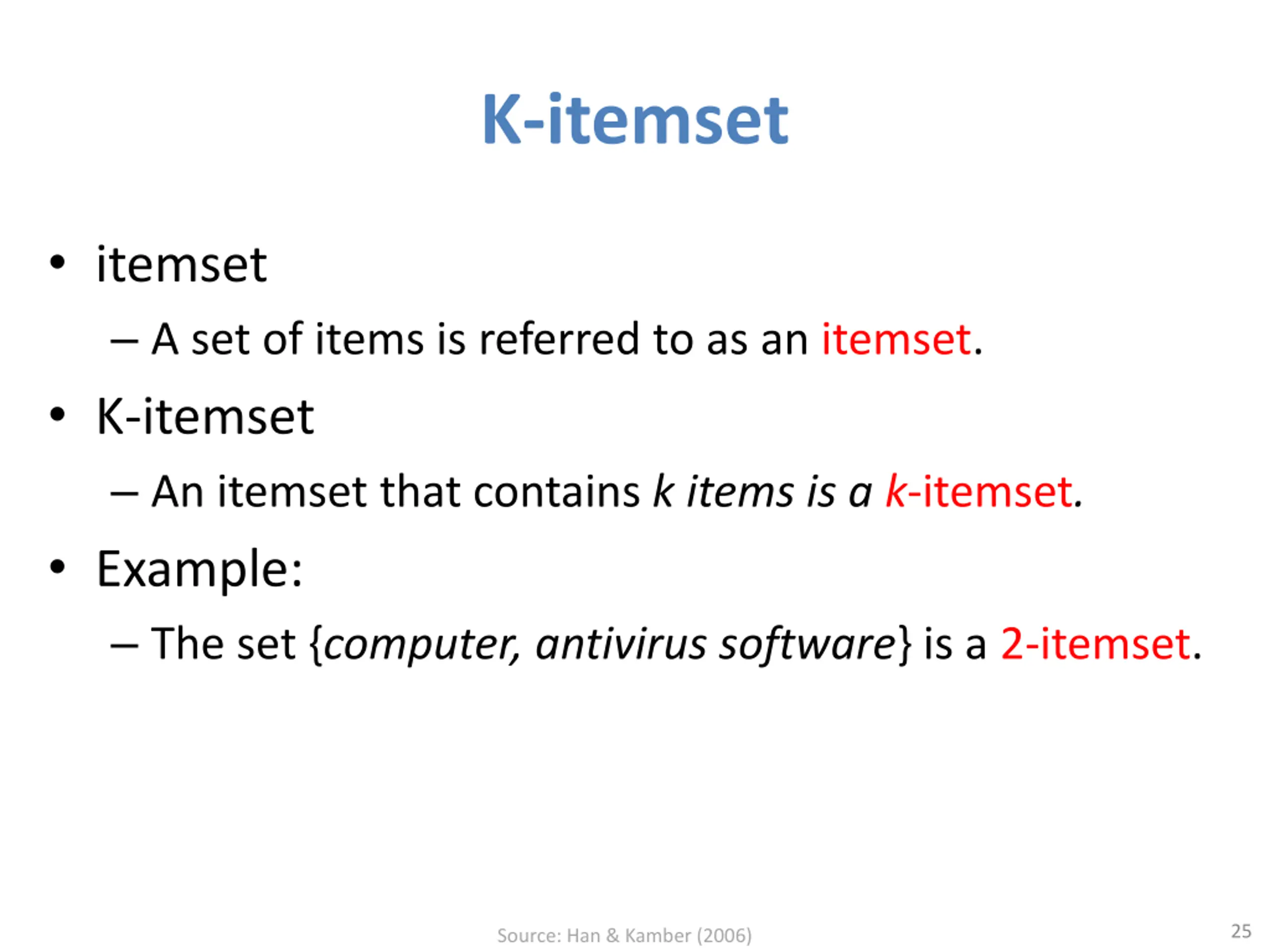 K-itemset itemset A set of items is referred to as an itemset. K-itemset An itemset that contains k items is a k-itemset. Example: The set {computer, antivirus software} is a 2-itemset. 25 Source: Han & Kamber (2006)