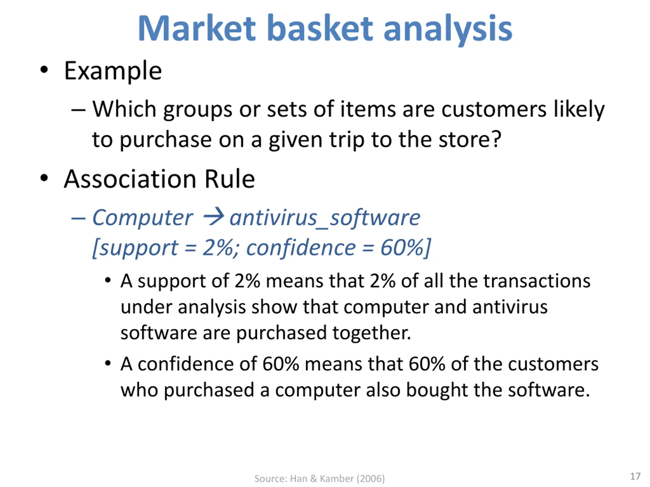 Market basket analysis Example Which groups or sets of items are customers likely to purchase on a given trip to the store? Association Rule Computer antivirus_software [support = 2%; confidence = 60%] A support of 2% means that 2% of all the transactions under analysis show that computer and antivirus software are purchased together. A confidence of 60% means that 60% of the customers who purchased a computer also bought the software. 17 Source: Han & Kamber (2006)