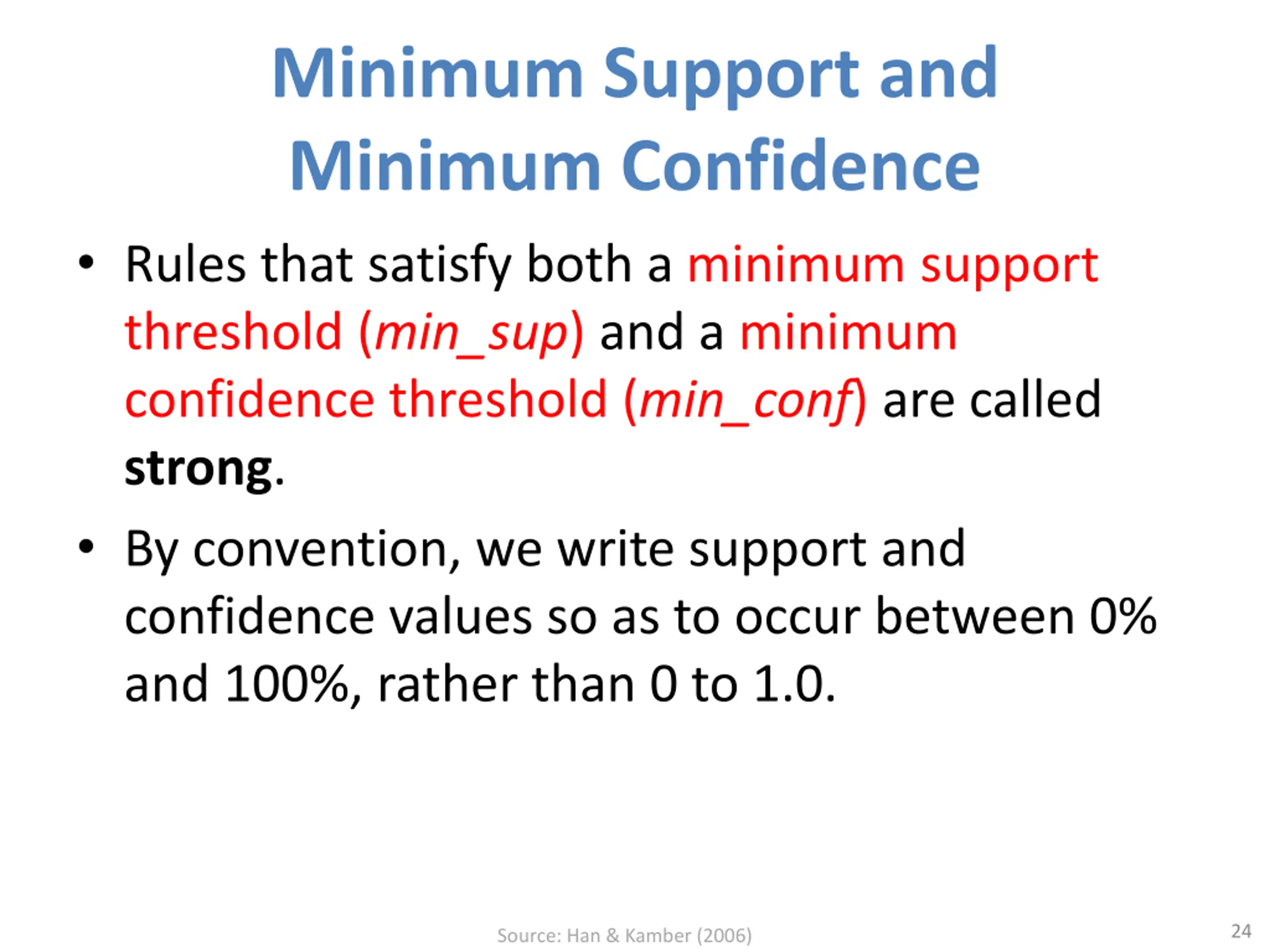 Minimum Support and Minimum Confidence Rules that satisfy both a minimum support threshold (min_sup) and a minimum confidence threshold (min_conf) are called strong. By convention, we write support and confidence values so as to occur between 0% and 100%, rather than 0 to 1.0. 24 Source: Han & Kamber (2006)