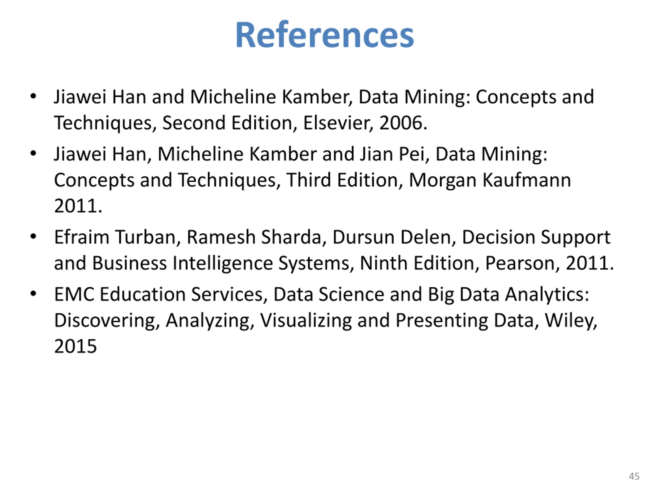 References Jiawei Han and Micheline Kamber, Data Mining: Concepts and Techniques, Second Edition, Elsevier, 2006. Jiawei Han, Micheline Kamber and Jian Pei, Data Mining: Concepts and Techniques, Third Edition, Morgan Kaufmann 2011. Efraim Turban, Ramesh Sharda, Dursun Delen, Decision Support and Business Intelligence Systems, Ninth Edition, Pearson, 2011. EMC Education Services, Data Science and Big Data Analytics: Discovering, Analyzing, Visualizing and Presenting Data, Wiley, 2015 45