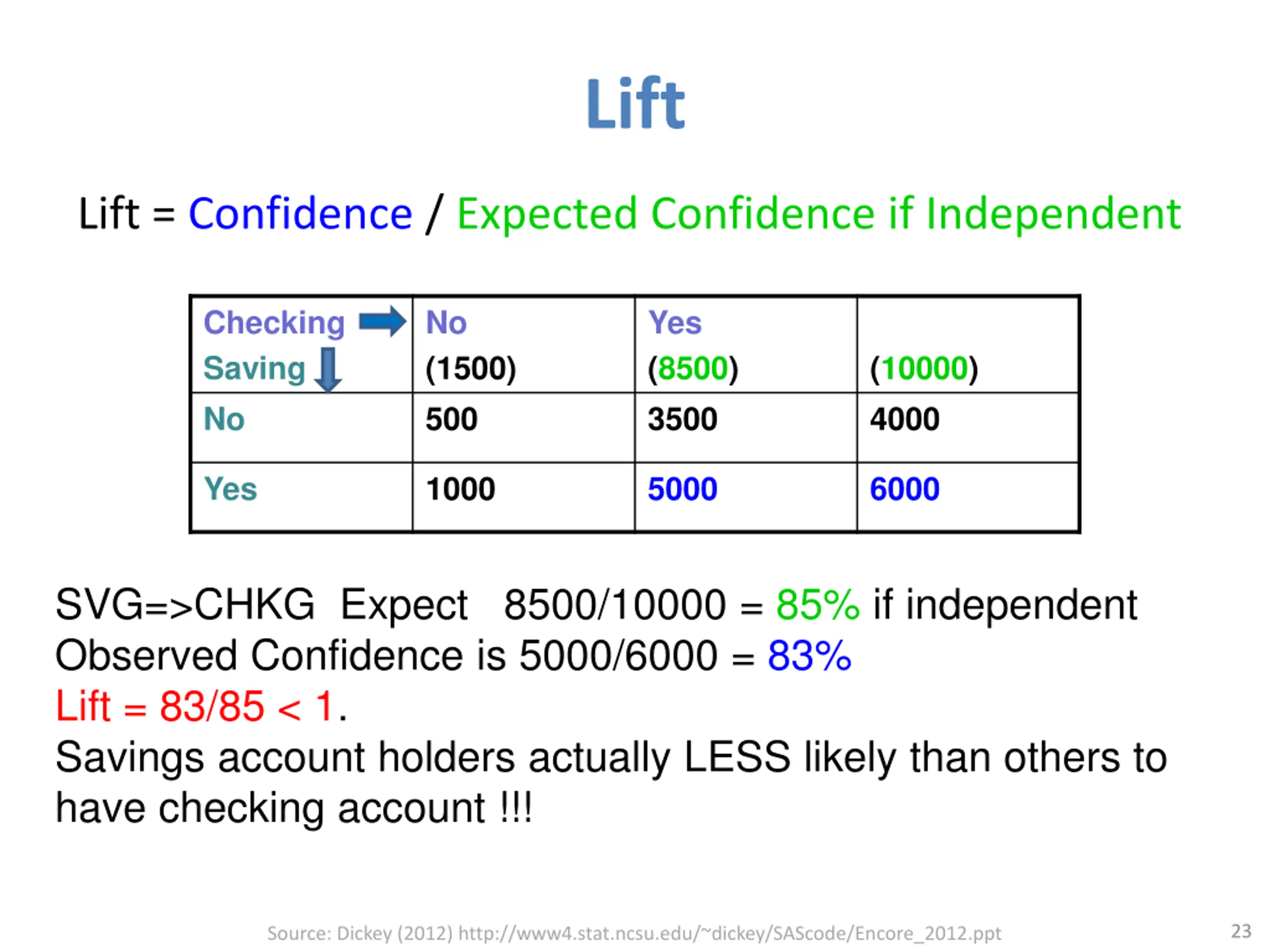 Lift Lift = Confidence / Expected Confidence if Independent Checking Saving No No (1500) 500 Yes (8500) 3500 (10000) 4000 Yes 1000 5000 6000 SVG=>CHKG Expect 8500/10000 = 85% if independent Observed Confidence is 5000/6000 = 83% Lift = 83/85 < 1. Savings account holders actually LESS likely than others to have checking account !!! 23 Source: Dickey (2012) http://www4.stat.ncsu.edu/~dickey/SAScode/Encore_2012.ppt