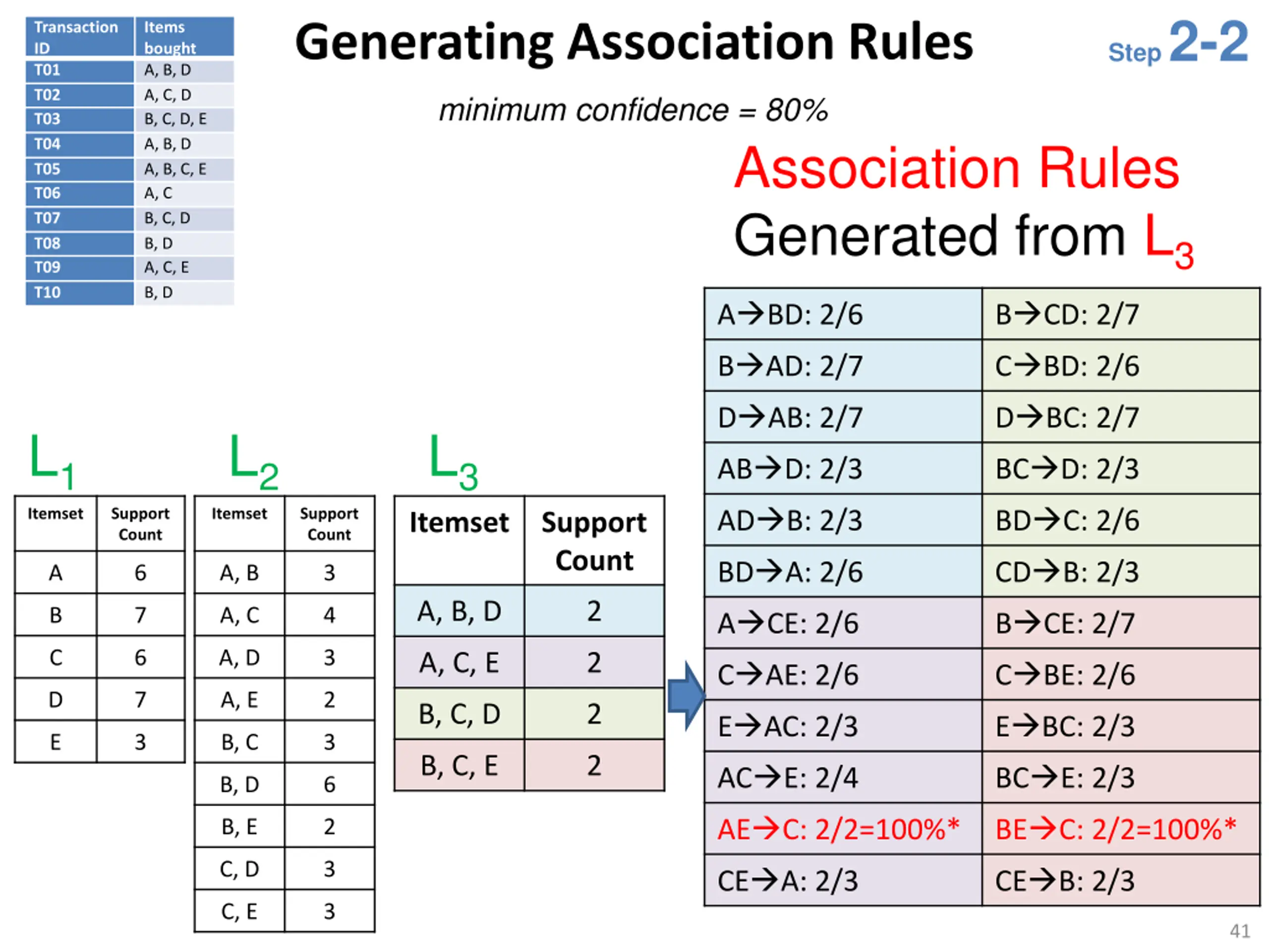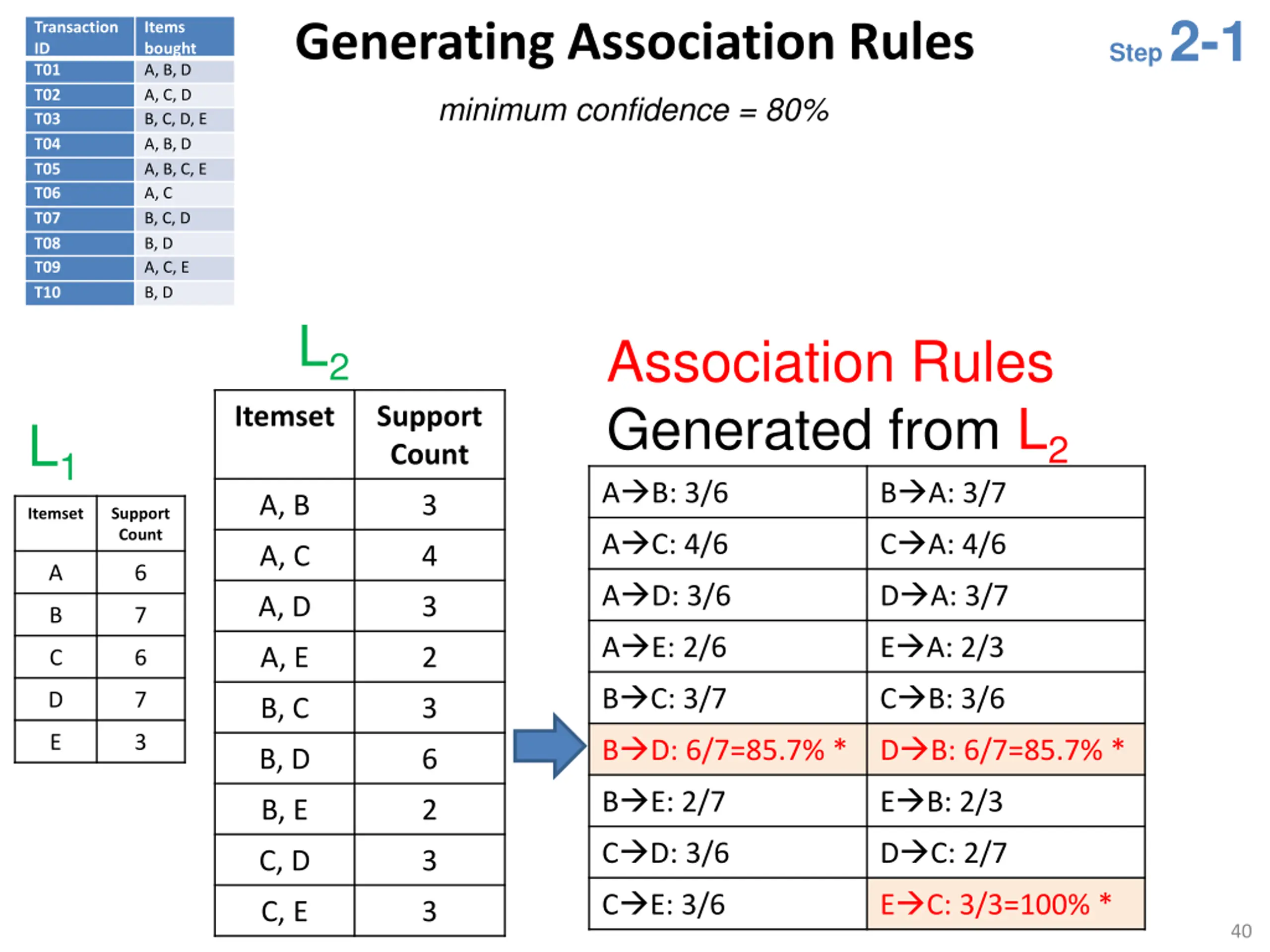 Step 2-1 Generating Association Rules Transaction ID T01 T02 T03 T04 T05 T06 T07 T08 T09 T10 Items bought A, B, D A, C, D B, C, D, E A, B, D A, B, C, E A, C B, C, D B, D A, C, E B, D minimum confidence = 80% L2 Association Rules Generated from L2 Itemset Support Count L1 A B: 3/6 A C: 4/6 A D: 3/6 A E: 2/6 B C: 3/7 B D: 6/7=85.7% * B E: 2/7 C D: 3/6 C E: 3/6 B A: 3/7 C A: 4/6 D A: 3/7 E A: 2/3 C B: 3/6 D B: 6/7=85.7% * E B: 2/3 D C: 2/7 E C: 3/3=100% * A, B 3 Itemset Support Count A, C 4 A 6 A, D 3 B 7 A, E 2 C 6 D 7 B, C 3 E 3 B, D 6 B, E 2 C, D 3 C, E 3 40