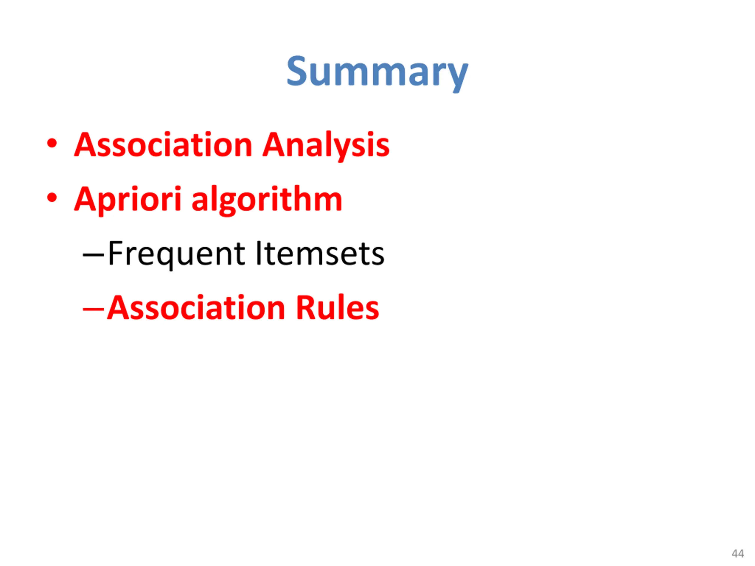 Summary Association Analysis Apriori algorithm Frequent Itemsets Association Rules 44