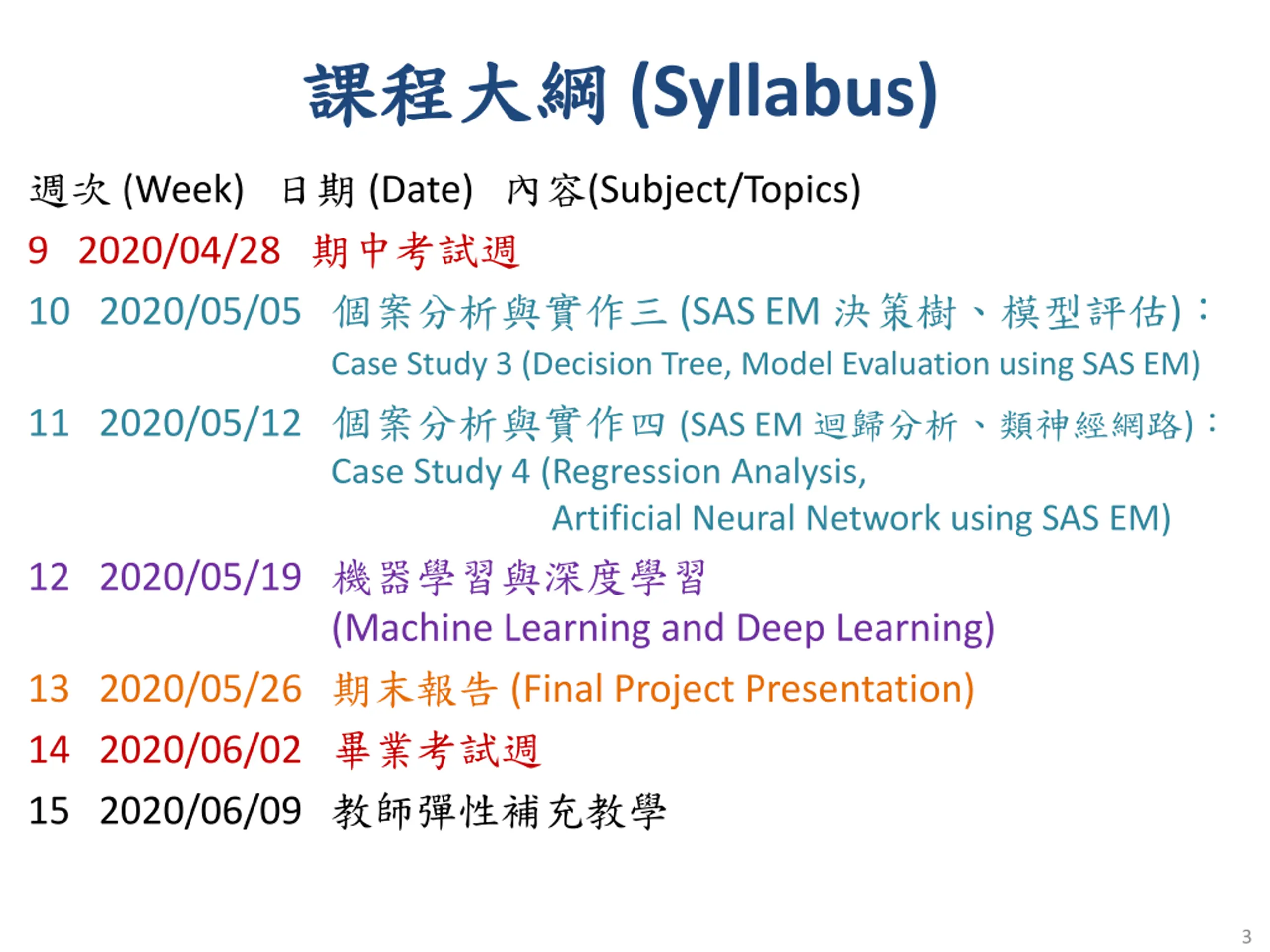 (Syllabus) (Week) (Date) (Subject/Topics) 9 2020/04/28 10 2020/05/05 (SAS EM ) Case Study 3 (Decision Tree, Model Evaluation using SAS EM) 11 2020/05/12 (SAS EM ) Case Study 4 (Regression Analysis, Artificial Neural Network using SAS EM) 12 2020/05/19 (Machine Learning and Deep Learning) 13 2020/05/26 (Final Project Presentation) 14 2020/06/02 15 2020/06/09 3