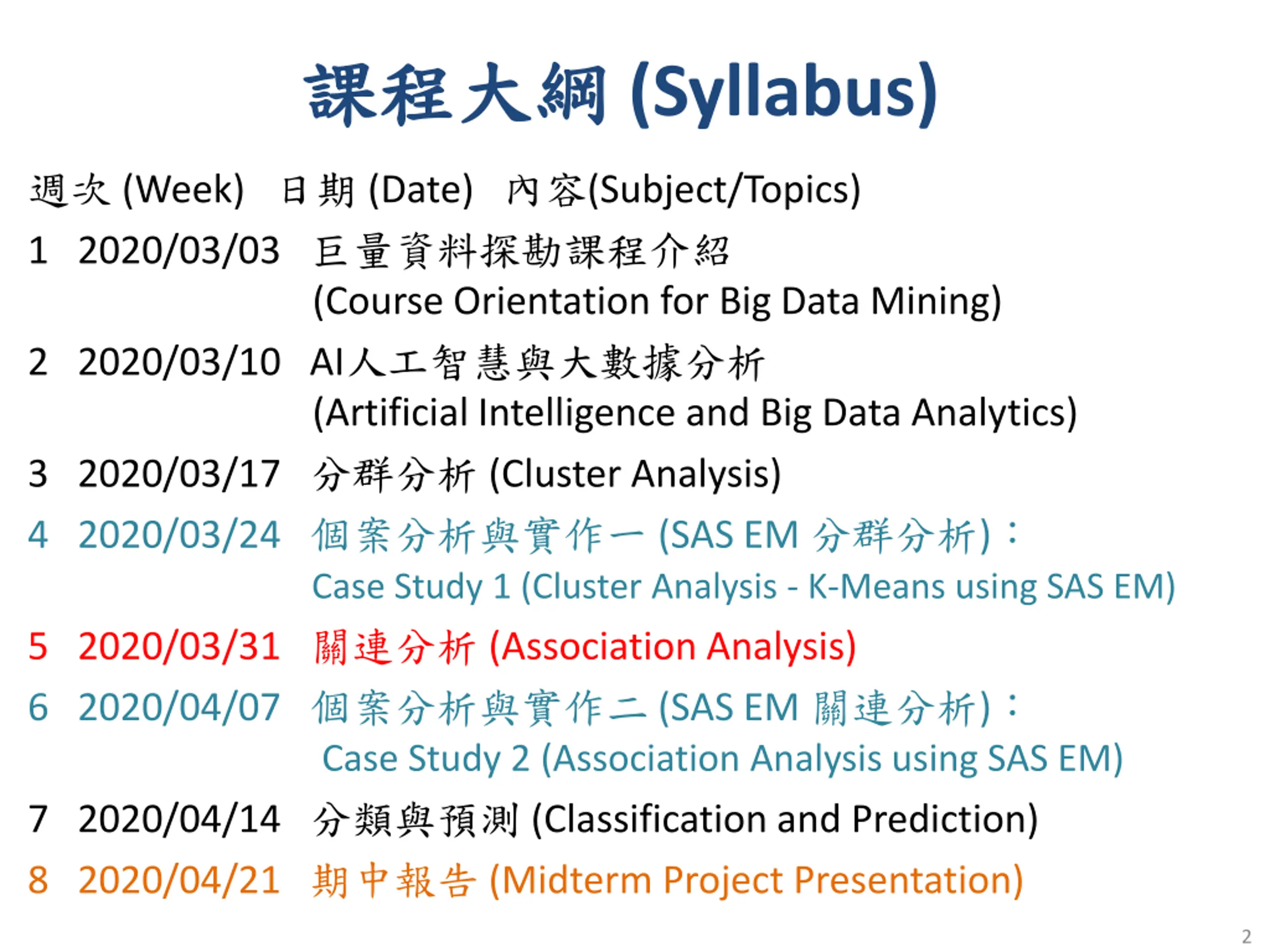 (Syllabus) (Week) (Date) (Subject/Topics) 1 2020/03/03 (Course Orientation for Big Data Mining) 2 2020/03/10 AI (Artificial Intelligence and Big Data Analytics) 3 2020/03/17 (Cluster Analysis) 4 2020/03/24 (SAS EM ) Case Study 1 (Cluster Analysis - K-Means using SAS EM) 5 2020/03/31 (Association Analysis) 6 2020/04/07 (SAS EM ) Case Study 2 (Association Analysis using SAS EM) 7 2020/04/14 (Classification and Prediction) 8 2020/04/21 (Midterm Project Presentation) 2