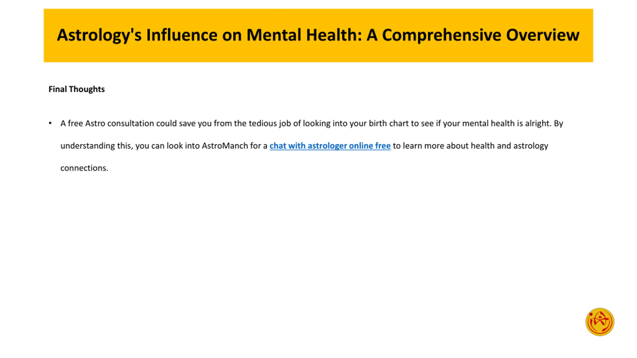 Astrology's Influence on Mental Health: A Comprehensive Overview Final Thoughts A free Astro consultation could save you from the tedious job of looking into your birth chart to see if your mental health is alright. By understanding this, you can look into AstroManch for a chat with astrologer online free to learn more about health and astrology connections.
