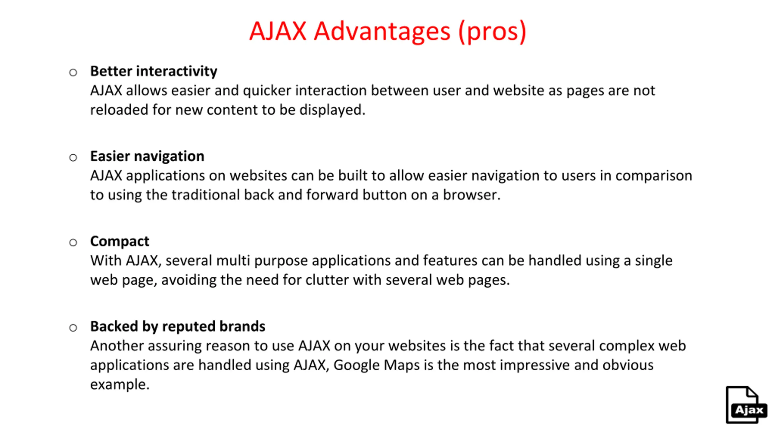 AJAX Advantages (pros) o Better interactivity AJAX allows easier and quicker interaction between user and website as pages are not reloaded for new content to be displayed. o Easier navigation AJAX applications on websites can be built to allow easier navigation to users in comparison to using the traditional back and forward button on a browser. o Compact With AJAX, several multi purpose applications and features can be handled using a single web page, avoiding the need for clutter with several web pages. o Backed by reputed brands Another assuring reason to use AJAX on your websites is the fact that several complex web applications are handled using AJAX, Google Maps is the most impressive and obvious example.