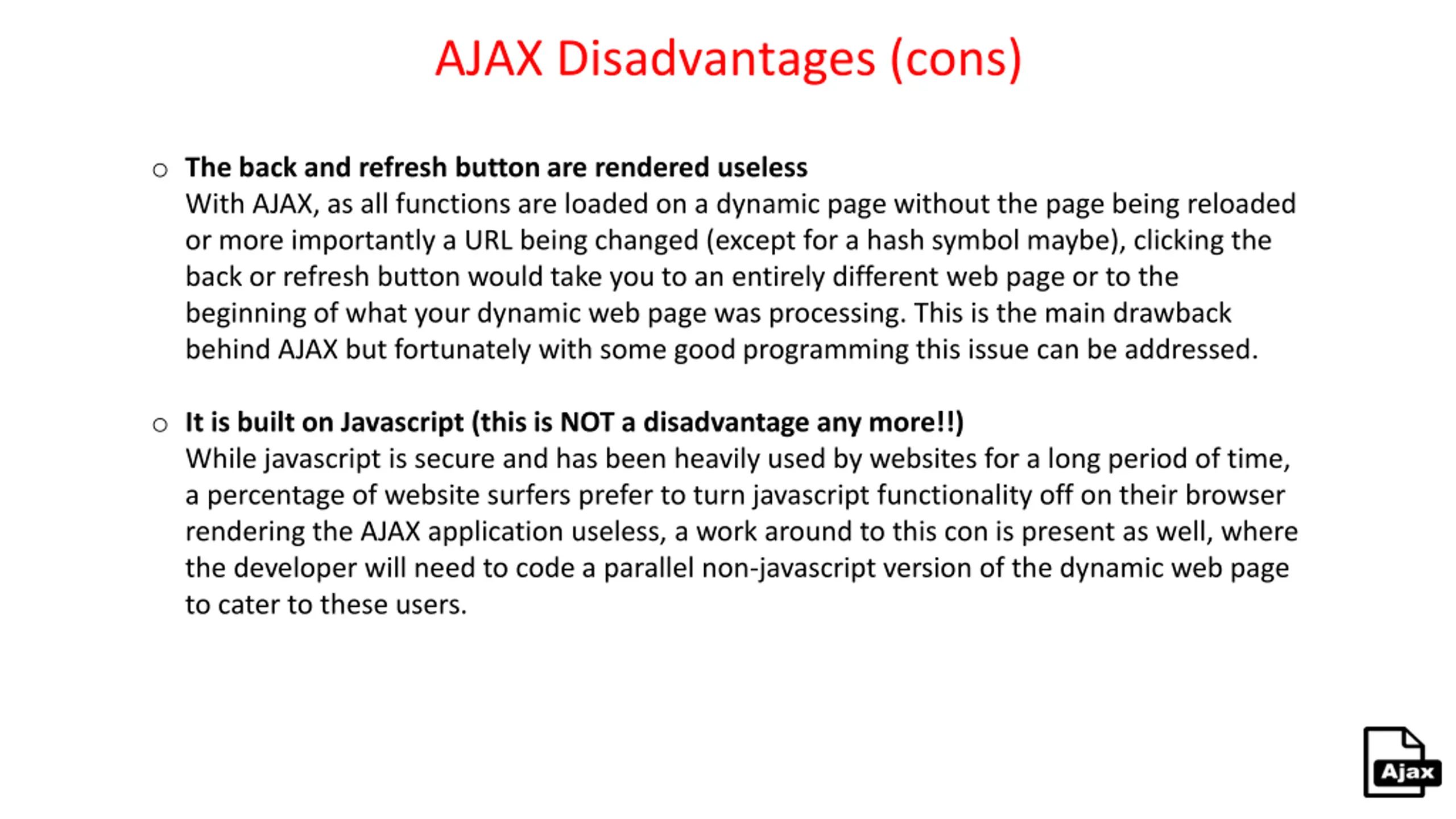 AJAX Disadvantages (cons) o The back and refresh button are rendered useless With AJAX, as all functions are loaded on a dynamic page without the page being reloaded or more importantly a URL being changed (except for a hash symbol maybe), clicking the back or refresh button would take you to an entirely different web page or to the beginning of what your dynamic web page was processing. This is the main drawback behind AJAX but fortunately with some good programming this issue can be addressed. o It is built on Javascript (this is NOT a disadvantage any more!!) While javascript is secure and has been heavily used by websites for a long period of time, a percentage of website surfers prefer to turn javascript functionality off on their browser rendering the AJAX application useless, a work around to this con is present as well, where the developer will need to code a parallel non-javascript version of the dynamic web page to cater to these users.