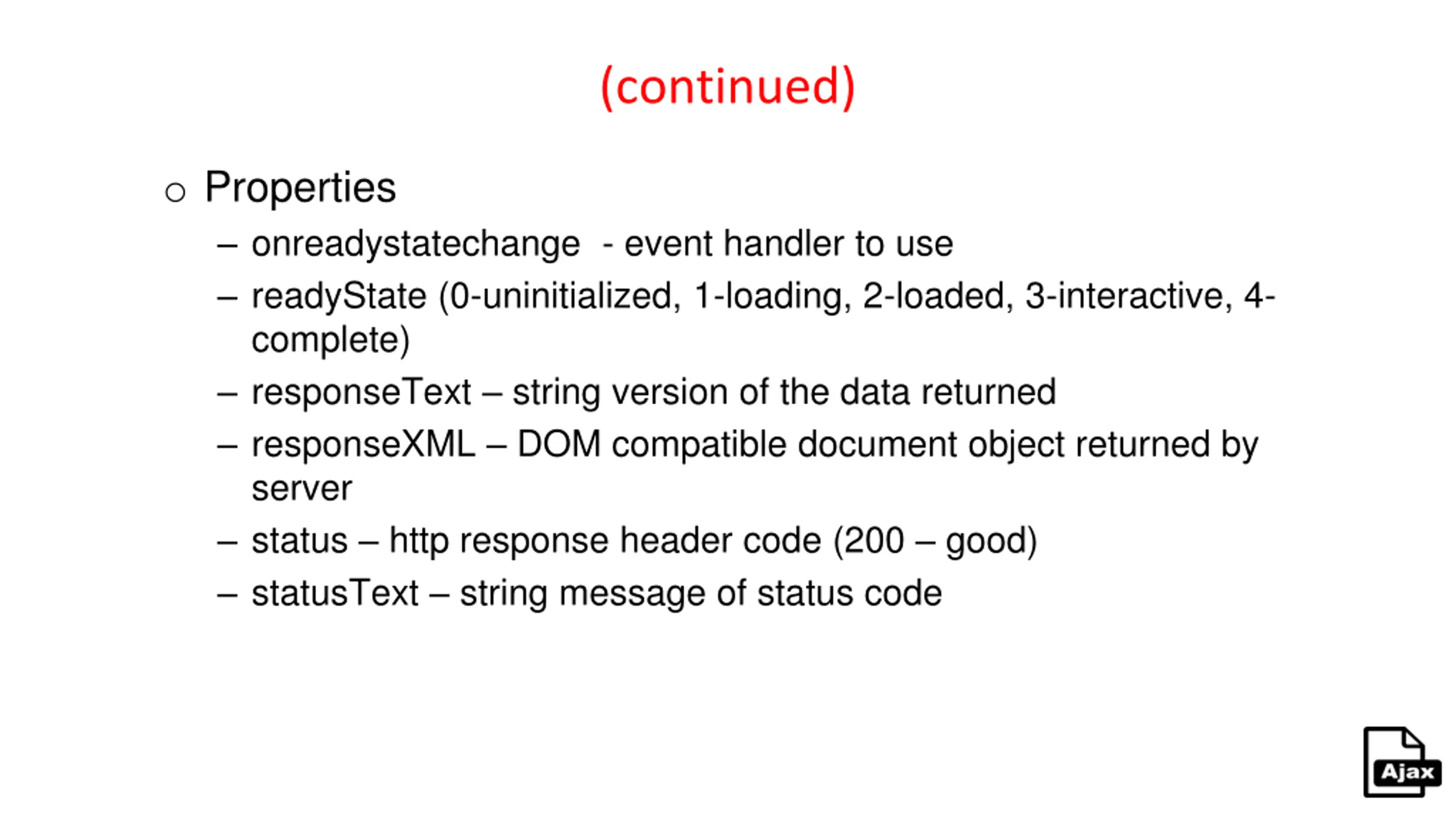 (continued) o Properties onreadystatechange - event handler to use readyState (0-uninitialized, 1-loading, 2-loaded, 3-interactive, 4- complete) responseText string version of the data returned responseXML DOM compatible document object returned by server status http response header code (200 good) statusText string message of status code