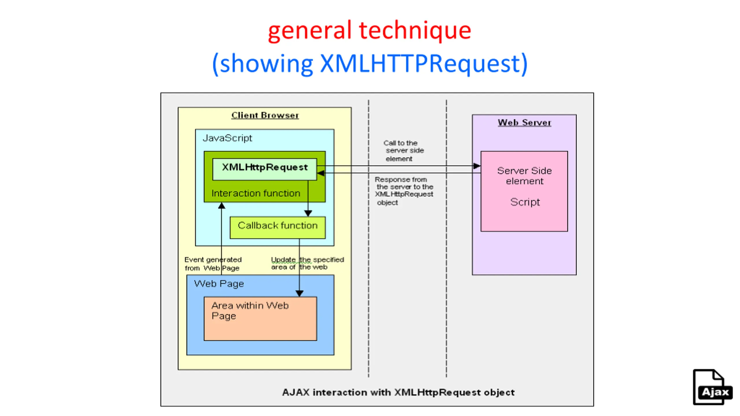 general technique (simplified model) Server-side Web Page Script requests server-side script to be run script run, XML/JSON created info parsed from XML / text / json and used to update DOM by Javascript XML document returned
