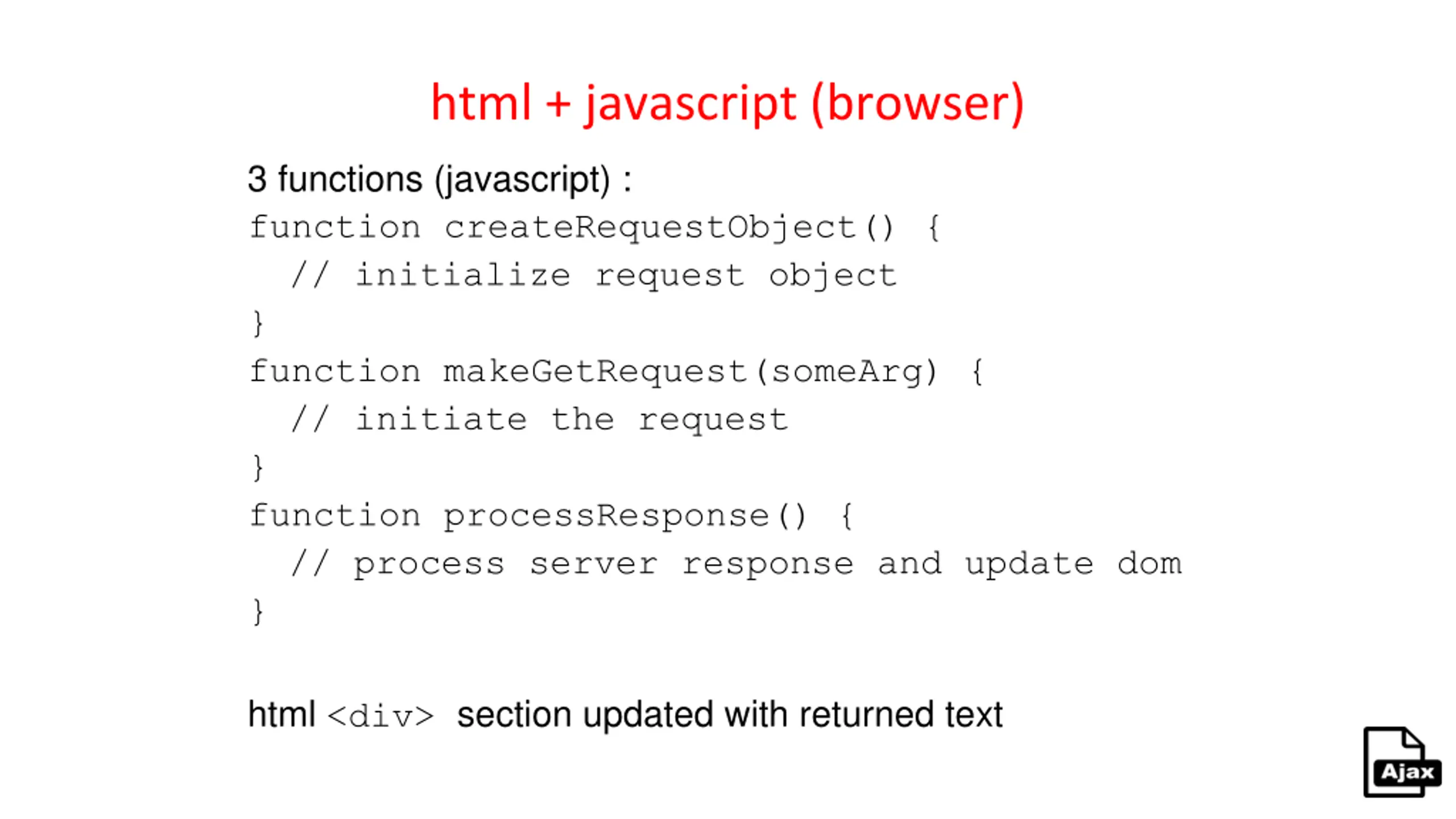 html + javascript (browser) 3 functions (javascript) : function createRequestObject() { // initialize request object } function makeGetRequest(someArg) { // initiate the request } function processResponse() { // process server response and update dom } html <div> section updated with returned text