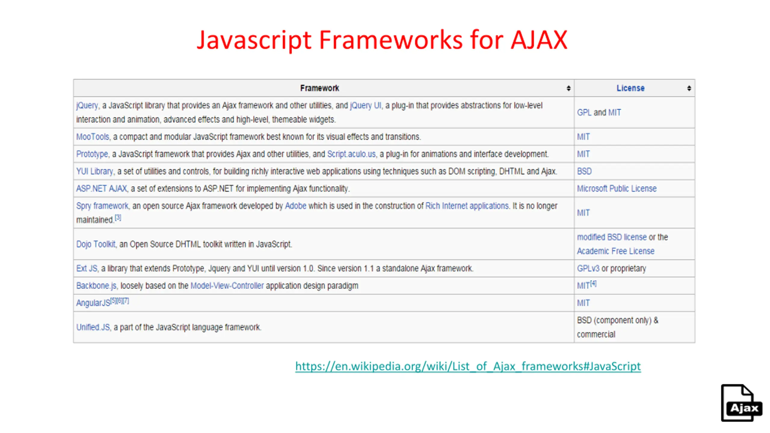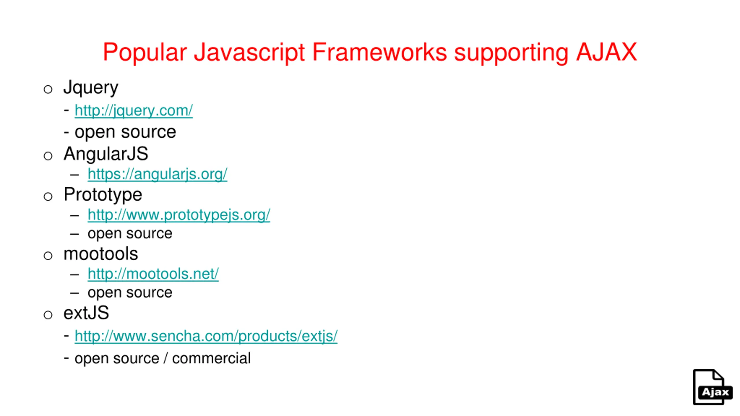 Popular Javascript Frameworks supporting AJAX o Jquery - http://jquery.com/ - open source o AngularJS https://angularjs.org/ o Prototype http://www.prototypejs.org/ open source o mootools http://mootools.net/ open source o extJS - http://www.sencha.com/products/extjs/ - open source / commercial