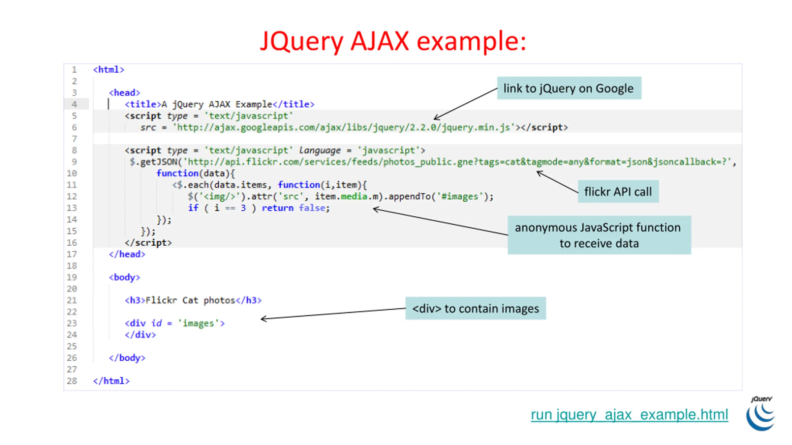 JQuery AJAX example: link to jQuery on Google flickr API call anonymous JavaScript function to receive data <div> to contain images run jquery_ajax_example.html