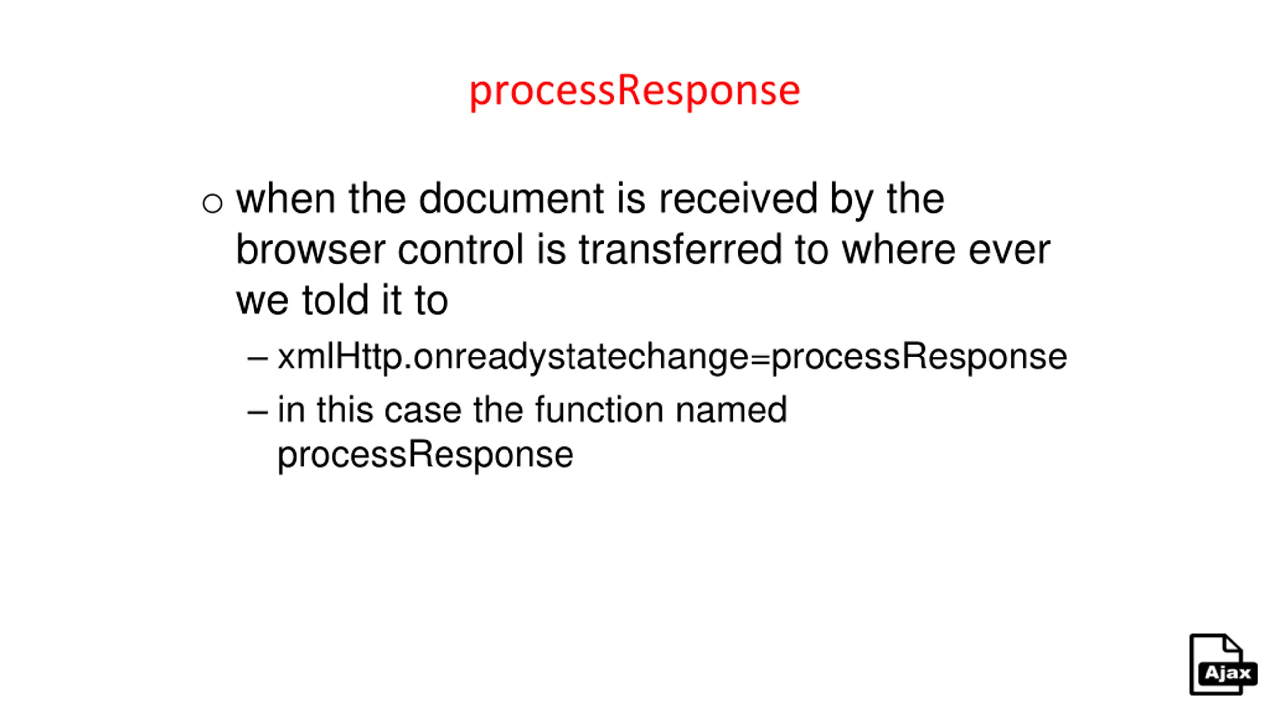 processResponse o when the document is received by the browser control is transferred to where ever we told it to xmlHttp.onreadystatechange=processResponse in this case the function named processResponse