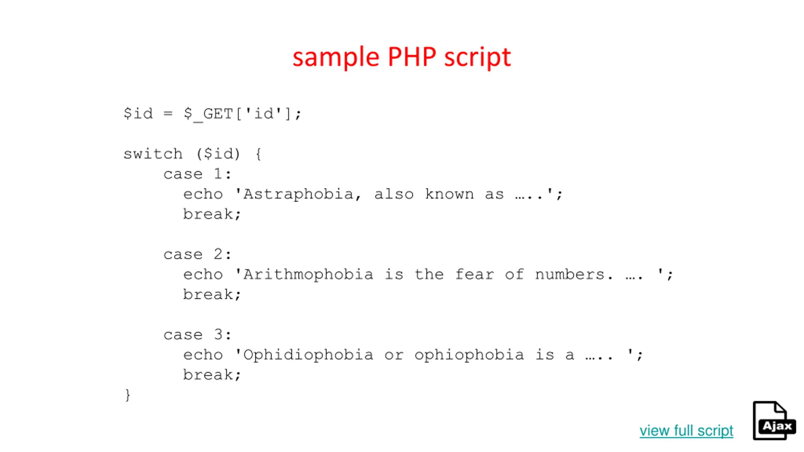 sample PHP script $id = $_GET['id']; switch ($id) { case 1: echo 'Astraphobia, also known as ..'; break; case 2: echo 'Arithmophobia is the fear of numbers. . '; break; case 3: echo 'Ophidiophobia or ophiophobia is a .. '; break; } view full script