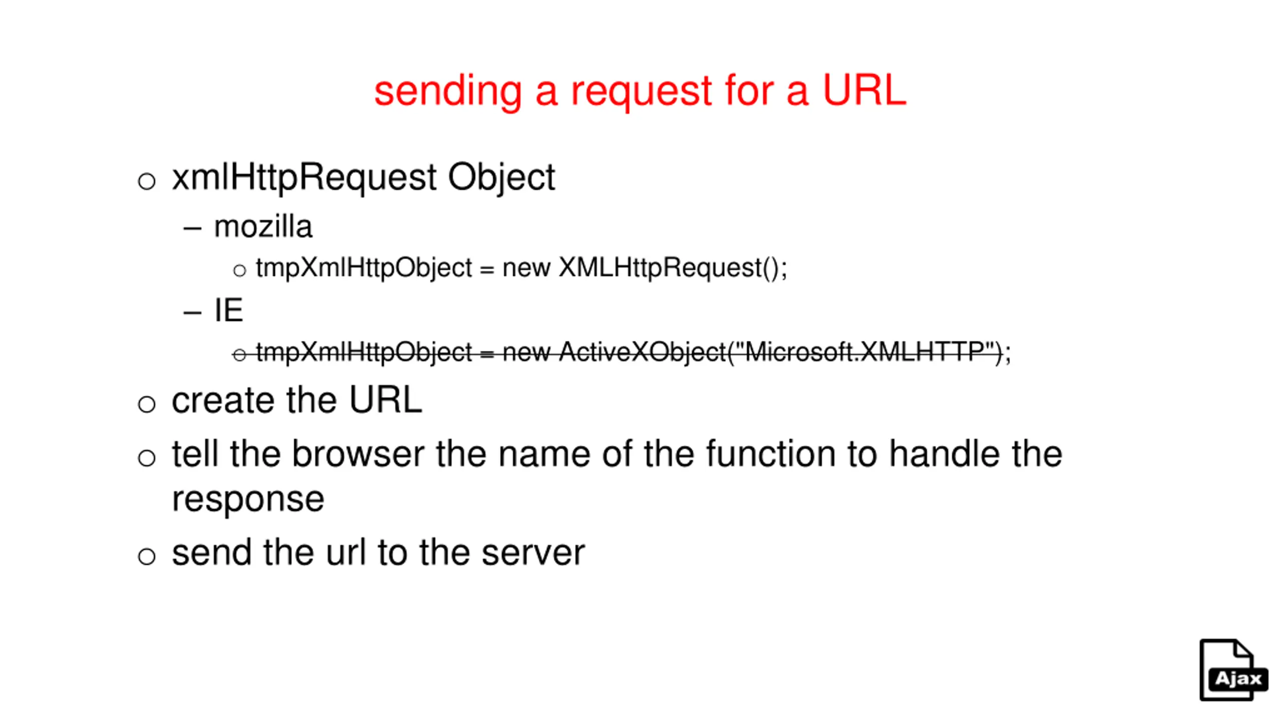 sending a request for a URL o xmlHttpRequest Object mozilla o tmpXmlHttpObject = new XMLHttpRequest(); IE o tmpXmlHttpObject = new ActiveXObject("Microsoft.XMLHTTP"); o create the URL o tell the browser the name of the function to handle the response o send the url to the server