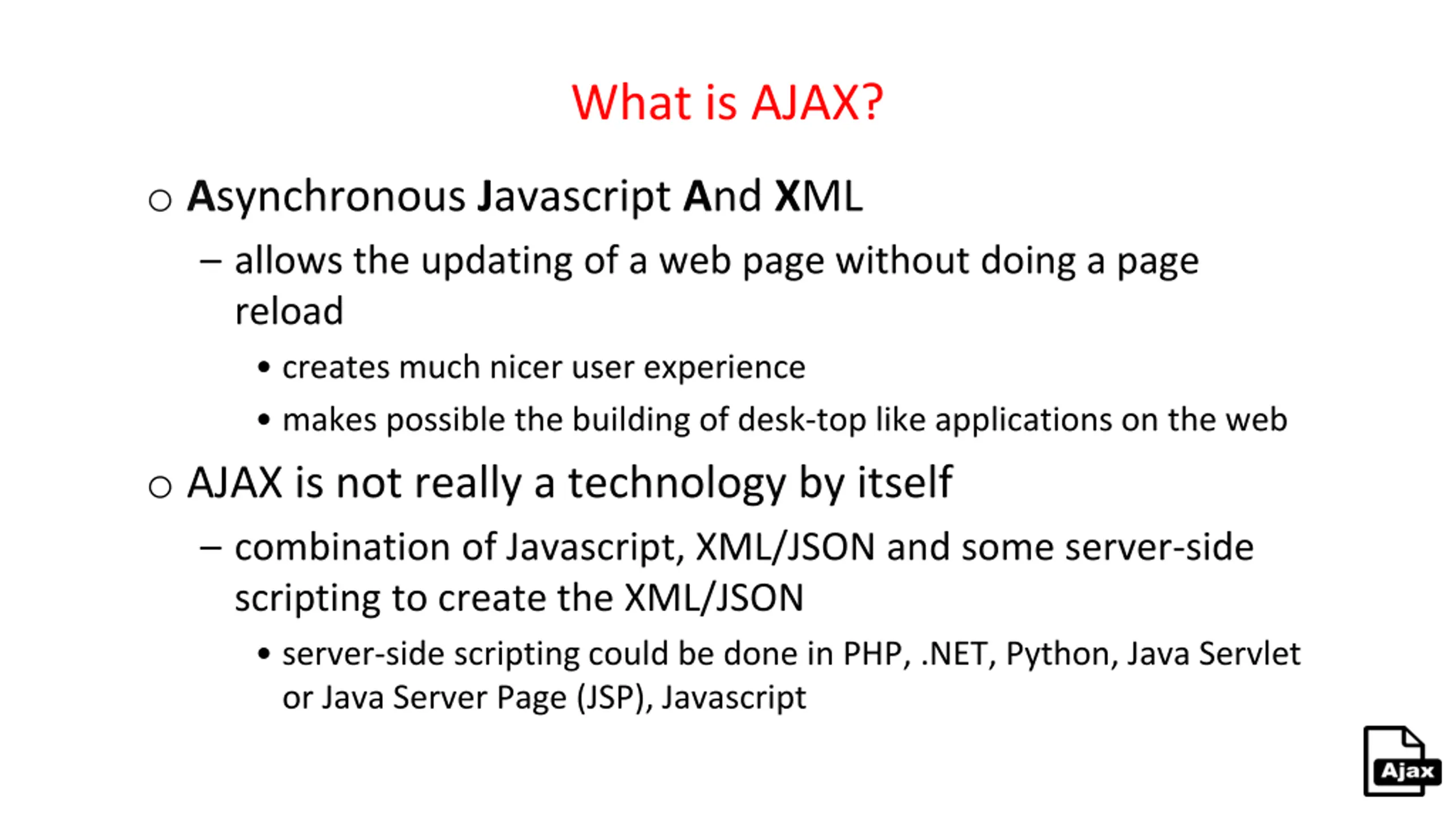 What is AJAX? o Asynchronous Javascript And XML allows the updating of a web page without doing a page reload creates much nicer user experience makes possible the building of desk-top like applications on the web o AJAX is not really a technology by itself combination of Javascript, XML/JSON and some server-side scripting to create the XML/JSON server-side scripting could be done in PHP, .NET, Python, Java Servlet or Java Server Page (JSP), Javascript