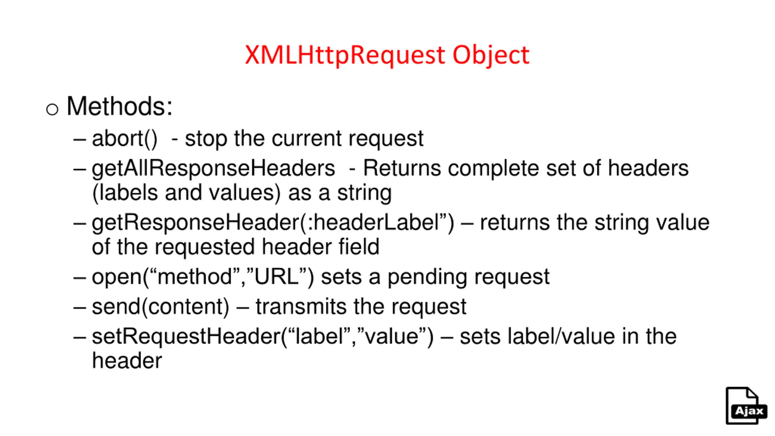 XMLHttpRequest Object o Methods: abort() - stop the current request getAllResponseHeaders - Returns complete set of headers (labels and values) as a string getResponseHeader(:headerLabel ) returns the string value of the requested header field open( method , URL ) sets a pending request send(content) transmits the request setRequestHeader( label , value ) sets label/value in the header