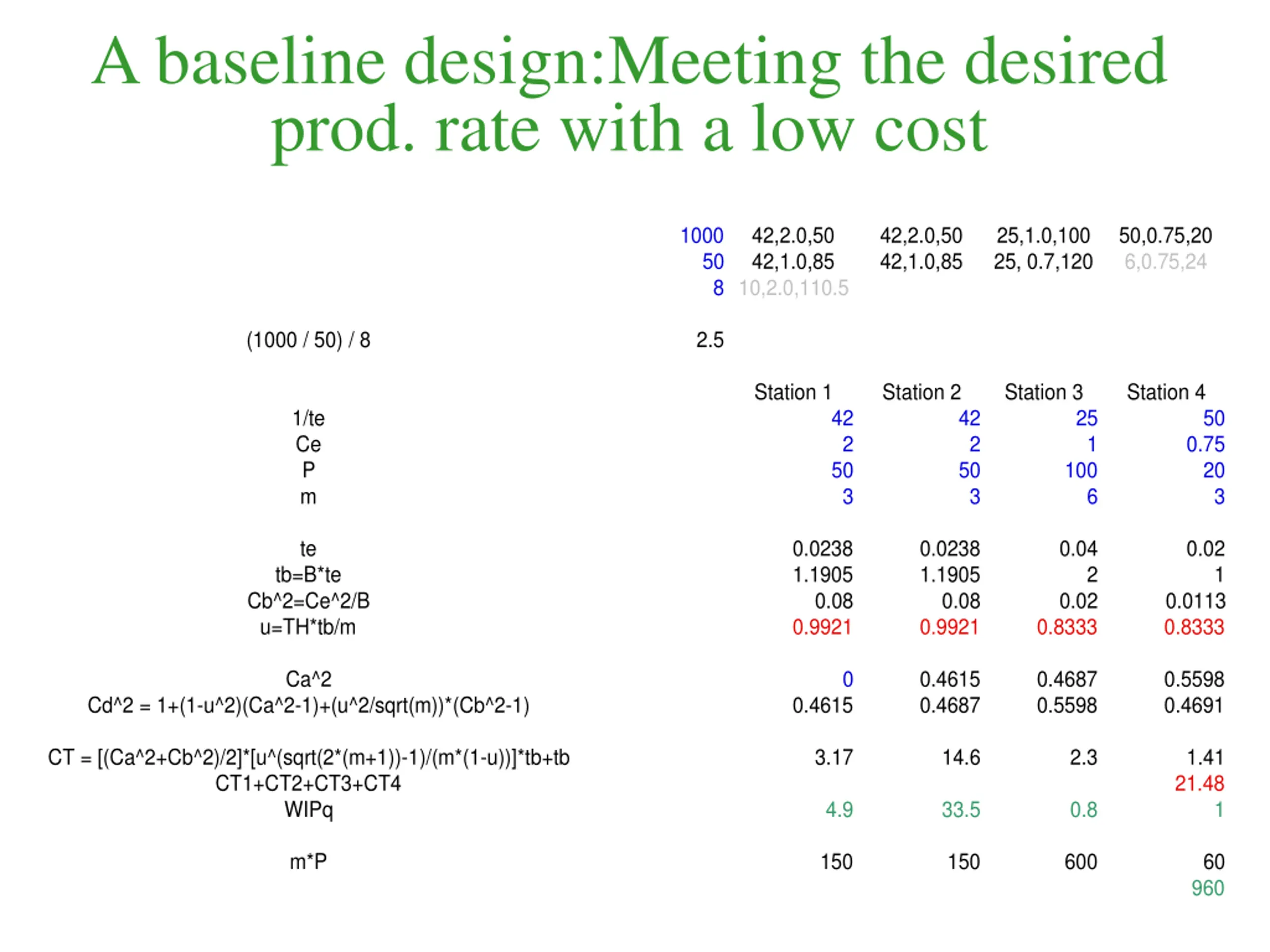 A baseline design:Meeting the desired prod. rate with a low cost 1000 42,2.0,50 42,1.0,85 8 10,2.0,110.5 42,2.0,50 42,1.0,85 25,1.0,100 25, 0.7,120 50,0.75,20 6,0.75,24 50 (1000 / 50) / 8 2.5 Station 1 Station 2 Station 3 Station 4 1/te Ce P m 42 2 50 3 42 2 50 3 25 1 50 0.75 20 100 6 3 te 0.0238 1.1905 0.08 0.9921 0.0238 1.1905 0.08 0.9921 0.04 0.02 tb=B*te Cb^2=Ce^2/B u=TH*tb/m 2 1 0.02 0.0113 0.8333 0.8333 Ca^2 0 0.4615 0.4687 0.4687 0.5598 0.5598 0.4691 Cd^2 = 1+(1-u^2)(Ca^2-1)+(u^2/sqrt(m))*(Cb^2-1) 0.4615 CT = [(Ca^2+Cb^2)/2]*[u^(sqrt(2*(m+1))-1)/(m*(1-u))]*tb+tb CT1+CT2+CT3+CT4 WIPq 3.17 14.6 2.3 1.41 21.48 4.9 33.5 0.8 1 m*P 150 150 600 60 960