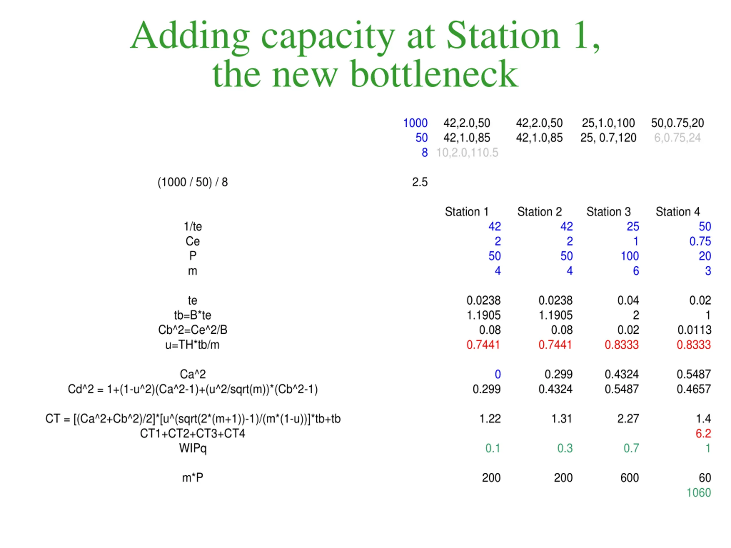 Adding capacity at Station 1, the new bottleneck 1000 42,2.0,50 42,1.0,85 8 10,2.0,110.5 42,2.0,50 42,1.0,85 25,1.0,100 25, 0.7,120 50,0.75,20 6,0.75,24 50 (1000 / 50) / 8 2.5 Station 1 Station 2 Station 3 Station 4 1/te Ce P m 42 2 50 4 42 2 50 4 25 1 50 0.75 20 100 6 3 te 0.0238 1.1905 0.08 0.7441 0.0238 1.1905 0.08 0.7441 0.04 0.02 tb=B*te Cb^2=Ce^2/B u=TH*tb/m 2 1 0.02 0.0113 0.8333 0.8333 Ca^2 0 0.299 0.4324 0.4324 0.5487 0.5487 0.4657 Cd^2 = 1+(1-u^2)(Ca^2-1)+(u^2/sqrt(m))*(Cb^2-1) 0.299 CT = [(Ca^2+Cb^2)/2]*[u^(sqrt(2*(m+1))-1)/(m*(1-u))]*tb+tb CT1+CT2+CT3+CT4 WIPq 1.22 1.31 2.27 1.4 6.2 0.1 0.3 0.7 1 m*P 200 200 600 60 1060