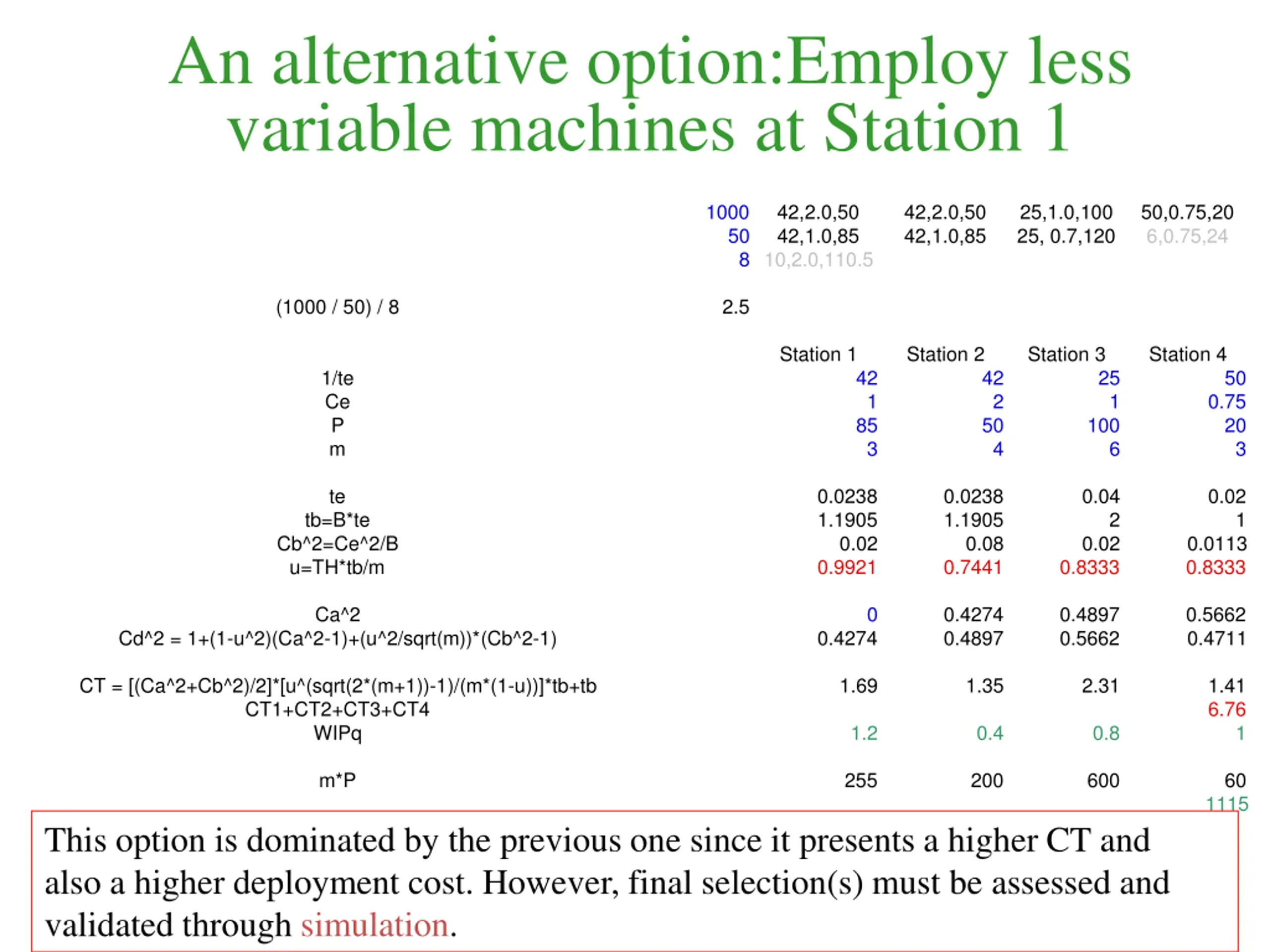 An alternative option:Employ less variable machines at Station 1 1000 42,2.0,50 42,1.0,85 8 10,2.0,110.5 42,2.0,50 42,1.0,85 25,1.0,100 25, 0.7,120 50,0.75,20 6,0.75,24 50 (1000 / 50) / 8 2.5 Station 1 Station 2 Station 3 Station 4 1/te Ce P m 42 1 85 3 42 2 50 4 25 1 50 0.75 20 100 6 3 te 0.0238 1.1905 0.02 0.9921 0.0238 1.1905 0.08 0.7441 0.04 0.02 tb=B*te Cb^2=Ce^2/B u=TH*tb/m 2 1 0.02 0.0113 0.8333 0.8333 Ca^2 0 0.4274 0.4897 0.4897 0.5662 0.5662 0.4711 Cd^2 = 1+(1-u^2)(Ca^2-1)+(u^2/sqrt(m))*(Cb^2-1) 0.4274 CT = [(Ca^2+Cb^2)/2]*[u^(sqrt(2*(m+1))-1)/(m*(1-u))]*tb+tb CT1+CT2+CT3+CT4 WIPq 1.69 1.35 2.31 1.41 6.76 1.2 0.4 0.8 1 m*P 255 200 600 60 1115 This option is dominated by the previous one since it presents a higher CT and also a higher deployment cost. However, final selection(s) must be assessed and validated through simulation.