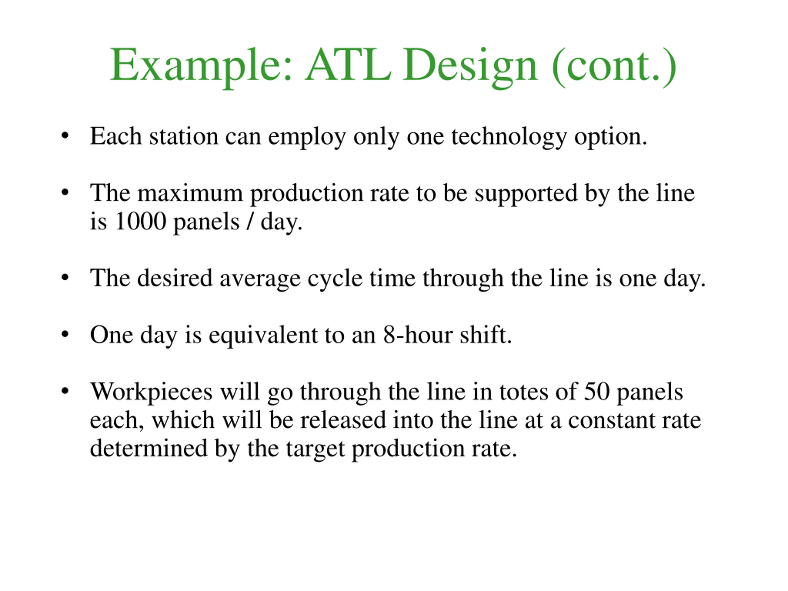Example: ATL Design (cont.) Each station can employ only one technology option. The maximum production rate to be supported by the line is 1000 panels / day. The desired average cycle time through the line is one day. One day is equivalent to an 8-hour shift. Workpieces will go through the line in totes of 50 panels each, which will be released into the line at a constant rate determined by the target production rate.